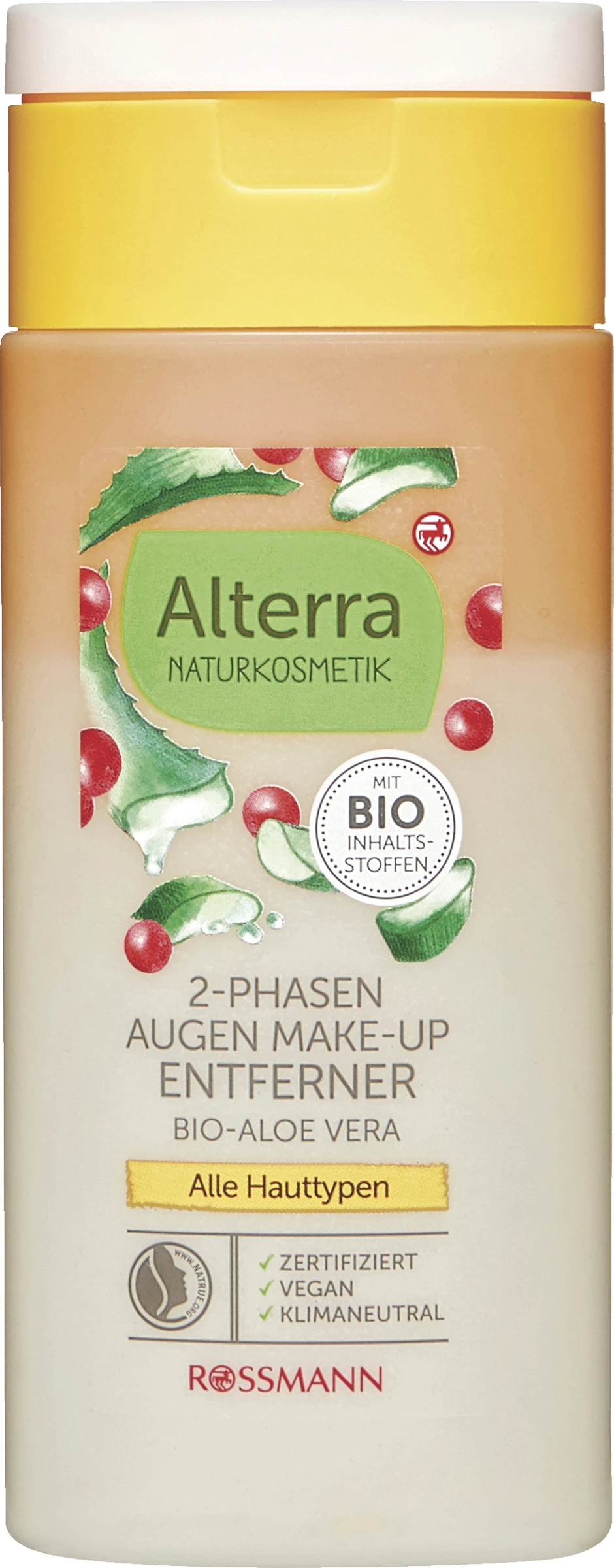 Der extra milde Alterra 2-Phasen AugenMake-up-Entferner mit Bio-Cranberryextrakt, Hyaluronsäure und Bio-Aloe Vera entfernt mühelos und schonend selbst wasserfestes Make-Up. Die Lipidformel mit wertvollen Bio-Ölen verhindert ein Austrocknen der Haut und pflegt gleichzeitig die Wimpern.