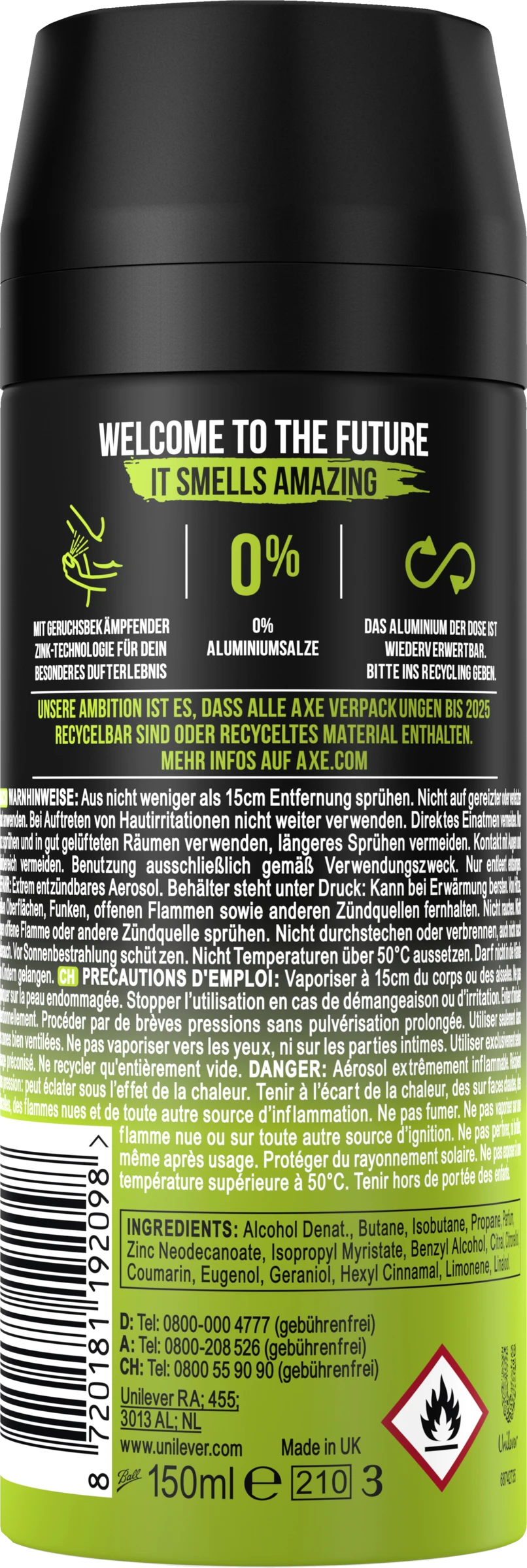 Alcohol Denat., Butane, Isobutane, Propane, Parfum, Zinc Neodecanoate, Isopropyl Myristate, Benzyl Alcohol, Citral, Citronellol, Coumarin, Eugenol, Geraniol, Hexyl Cinnamal, Limonene, Linalool