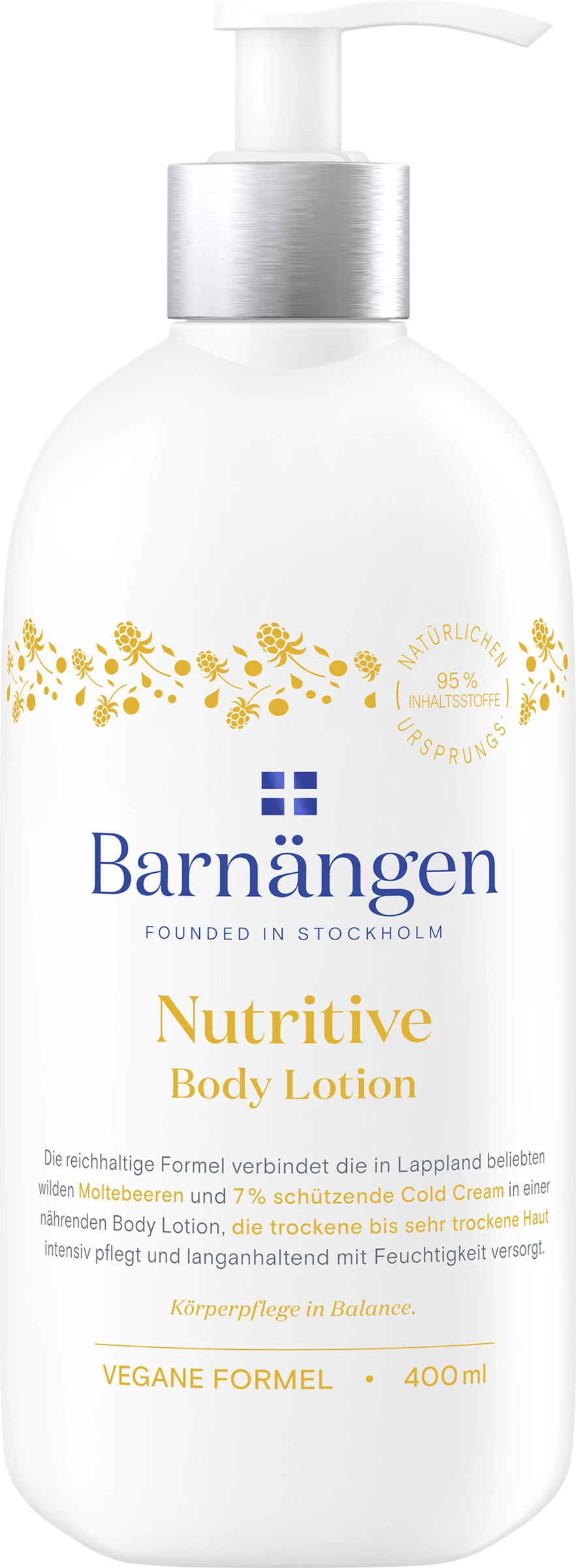 Die reichhaltige Formel verbindet die in Lappland beliebten wilden Moltebeeren und 7% schützende Cold Cream in einer nährenden Body Lotion, die trockene bis sehr trockene Haut intensiv pflegt und langanhaltend mit Feuchtigkeit versorgt. Lassen Sie sich von der Natur und den Traditionen Schwedens begeistern! Das Geheimnis der Rezeptur unserer ersten Seife, für die Barnängen seit der Gründung 1868 berühmt ist, inspirierte uns zu unserer Cold Cream, um Ihrer Haut Schutz zu bieten, damit Sie sich einfach gut fühlen. Dermatologisch getestet.