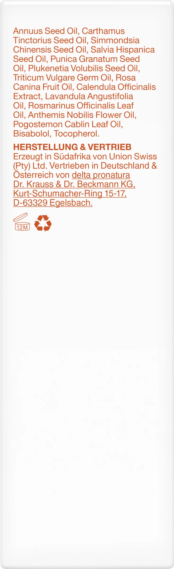 Glycine Soja Oil, Helianthus Annuus Seed Oil, Carthamus Tinctorius Seed Oil, Simmondsia Chinensis Seed Oil, Salvia Hispanica Seed Oil, Punica Granatum Seed Oil, Plukenetia Volubilis Seed Oil, Triticum Vulgare Germ Oil, Rosa Canina Fruit Oil, Calendula Officinalis Extract, Lavandula Angustifolia Oil, Rosmarinus Officinalis Leaf Oil, Anthemis Nobilis Flower Oil, Pogostemon Cablin Leaf Oil, Bisabolol, Tocopherol.