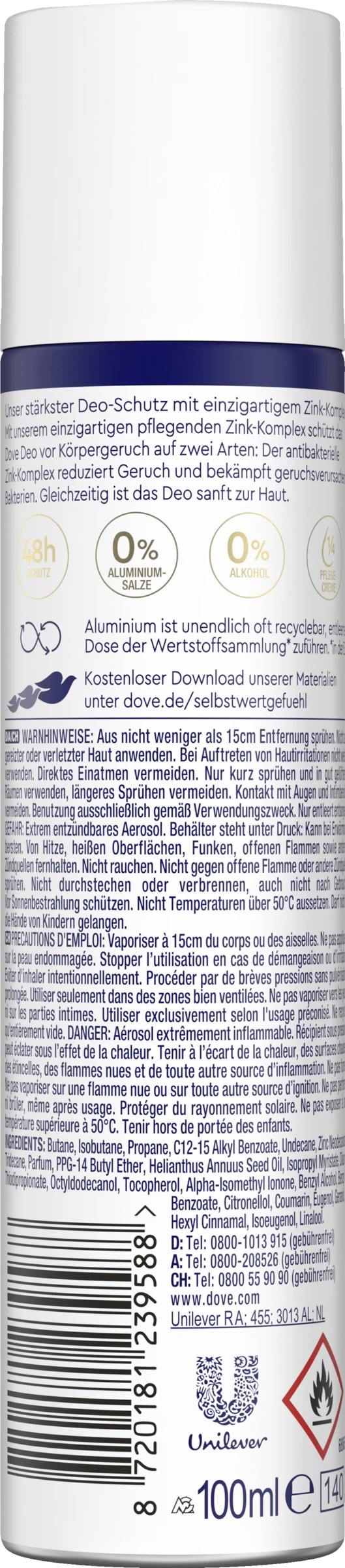 Das Dove Deodorant Spray Original mit pflegendem Zink-Komplex bietet 48 Stunden Schutz und verleiht den ganzen Tag ein frisches und sauberes Gefühl. Die Formel mit 1/4 Pflegecreme ist sanft zur Haut und macht die zarte Achselhaut glatt und geschmeidig.