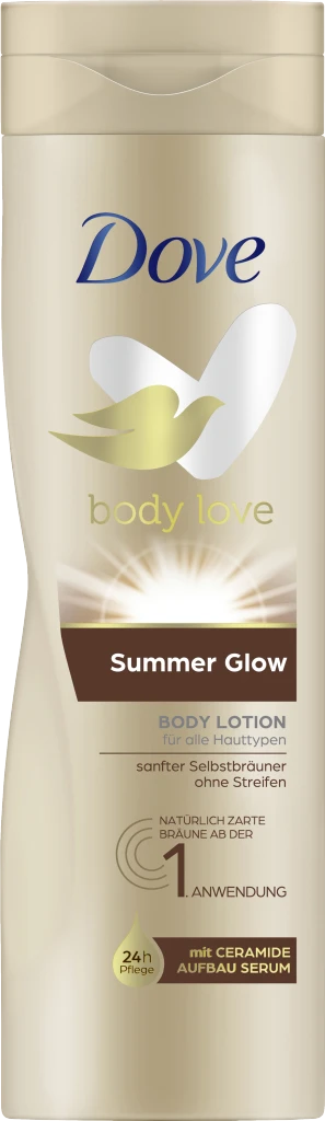 Keine Frage, ein sonnengeküsster Hautteint sieht einfach schön aus. Aber was, wenn die Sonne mal wieder nicht scheinen will? Dann verwöhne die Haut mit der Dove PFLEGE PLUS Summer Glow Body Lotion. Sie verleiht müder, blasser Haut im Handumdrehen neue Frische und einen zart gebräunten, sommerlichen Hautton. Die reichhaltige Formel mit exklusivem Dove PflegeDUO spendet 24h tiefenwirksame Feuchtigkeit, die die Haut viel frischer strahlen lässt. Außerdem zaubert die verwöhnende Body Lotion gleichzeitig diesen wunderschön goldenen, gepflegten Sommer-Look herbei! Mit viel Pflege, die man sofort spürt, und einem sanften Selbstbräuner, der bereits nach kurzer Zeit seine Wirkung zeigt. Ganz ohne zu kleben, mit einem zarten Duft und eben diesem tollen Effekt: ein wunderschöner Summer Glow bis in die Zehenspitzen das ganze Jahr hindurch, wann immer die Sonne sich rar macht. Das hebt die Laune – und freut gleichzeitig die Haut, weil sie die Pflege bekommt, die sie braucht, um so zu strahlen…
