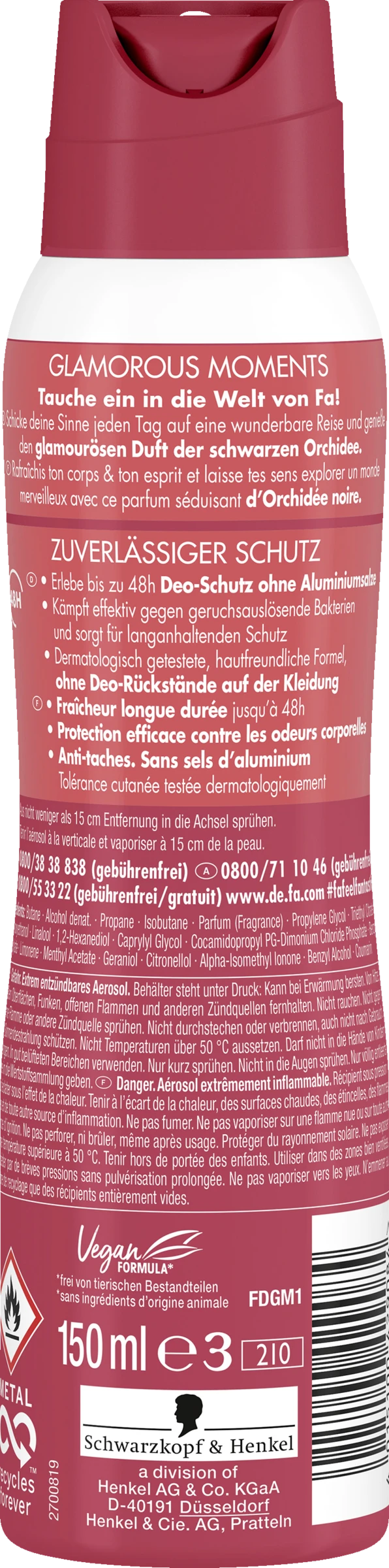 Butane*Alcohol denat.*Propane*Isobutane*Parfum (Fragrance)*Propylene Glycol*Triethyl Citrate*Phenoxyethanol*Linalool*1,2-Hexanediol*Caprylyl Glycol*Cocamidopropyl PG-Dimonium Chloride Phosphate*Benzyl Salicylate*Limonene*Menthyl Acetate*Geraniol*Citronellol*Alpha-Isomethyl Ionone*Benzyl Alcohol*Coumarin