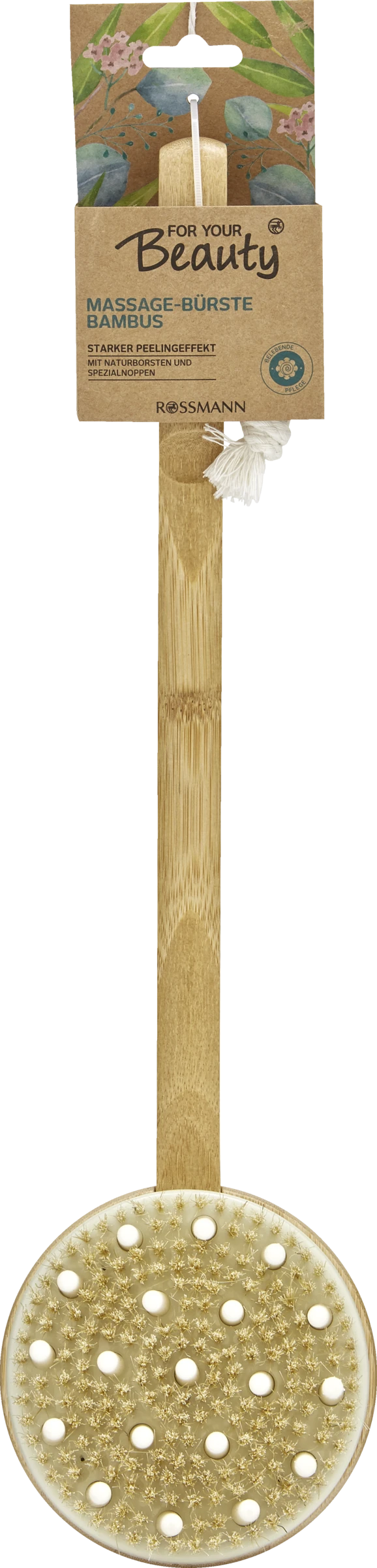 Genießen Sie mit der for your Beauty Bambus Massage-Bürste eine belebende Massage. Der Bürstenkopf besteht aus 100% Naturborsten & Spezialmassagenoppen, welche sich besonders gut für intensive Massagen eignen. Durch den gebogenen Griff ist er ein ideales Hilfsmittel um auch schwer erreichbare Köperbereiche wie den Rücken gründlich zu reinigen und zu massieren. Das Holz der Massagebürste besteht aus Bambus, welches aus vorbildlich bewirtschafteten Wäldern bezogen wird. Es wächst extrem schnell nach und hat von Natur aus eine antibakterielle Wirkung. Die Massagebürste entfernt alte Hautschuppen, fördert die Durchblutung und lockert das Muskelgewebe.