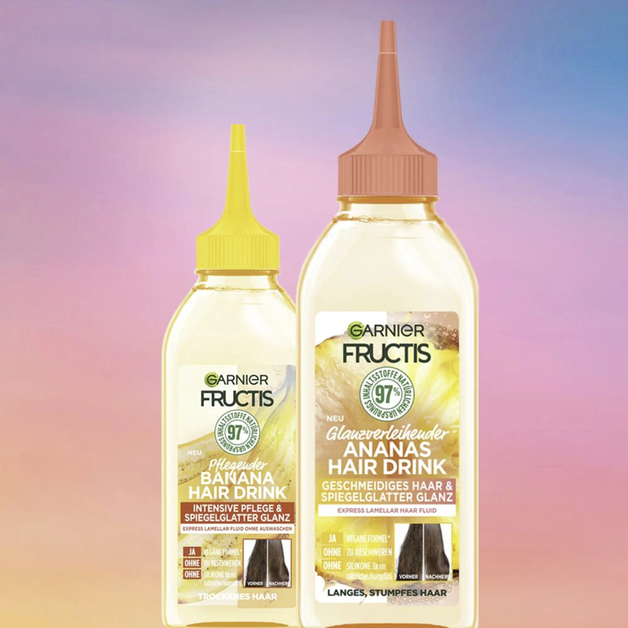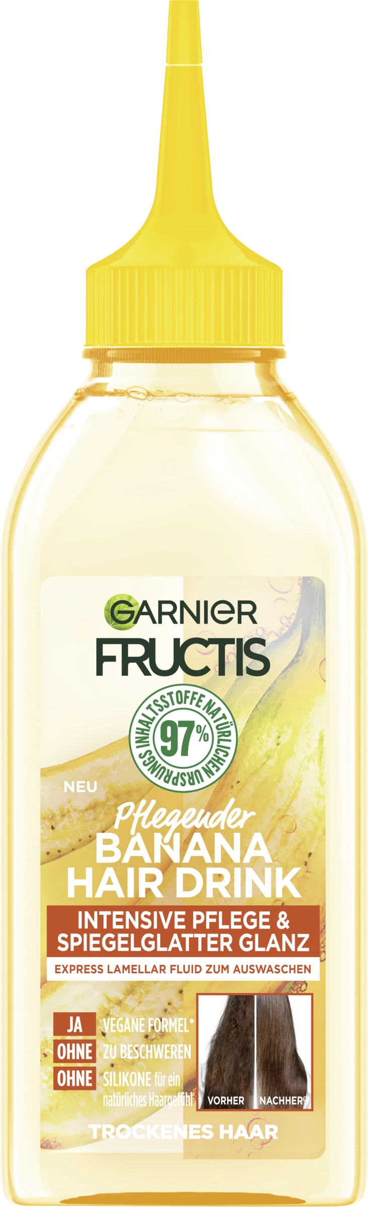 Der Garnier Fructis Bananen Hair Drink ist ein reichhaltiges Haarfluid, welches speziell auf die Bedürfnisse von trockenem Haar abgestimmt wurde. Die Formel mit Inhaltsstoffen natürlichen Ursprungs, wie Banane und Kokosnuss-Öl, enthält winzig kleine Lamellen, die sich in die Risse auf der Haaroberfläche legen, um die Haare weich zu pflegen. Dabei bietet das Express Lamellar Haarfluid sowohl eine intensive Pflege, als auch einen wunderschönen Glanz – ohne zu beschweren. Gleichzeitig fördert die Formel ein natürliches Haargefühl.
