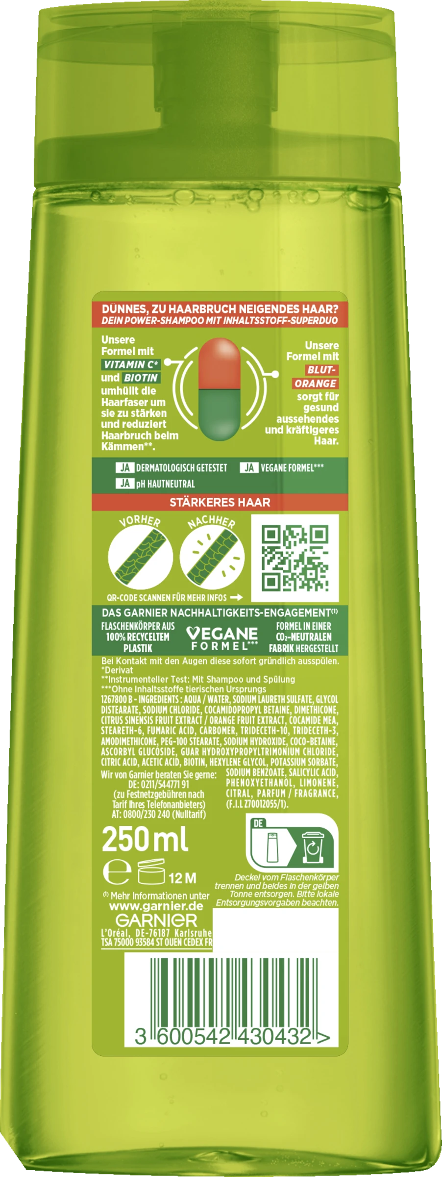Das Garnier Fructis Vitamine & Kraft Kräftigendes Shampoo eignet sich insbesondere für die Anwendung bei dünnem, zu Haarbruch neigendem Haar. Mit der vitaminreichen Kombination aus der Superfruit Blutorange sowie den tiefenwirsamen Inhaltsstoffen Vitamin C Derivat und Biotin wird der Haarfaser spezielle Kraft verliehen. Die Haare werden gestärkt und erscheinen kraftvoller – vom Ansatz bis in die Spitzen. Zudem wird Haarverlust dank Anti-Haarbruch-Effekt beim Kämmen vorgebeugt und somit das Haar beim Kämmen geschützt. So erscheint das Haar sichtbar kräftiger und glänzender. Zudem wurde das Shampoo dermatologisch getestet und ist auch für empfindliche Haartypen geeignet.
