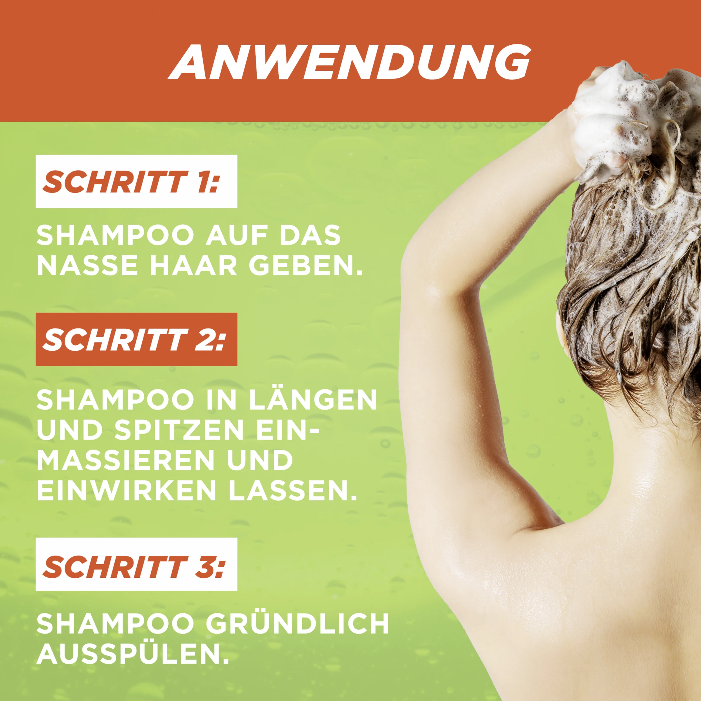 Das Garnier Fructis Vitamine & Kraft Kräftigendes Shampoo in das nasse Haar geben, danach in den Längen und Spitzen verteilen und sanft einmassieren. Kurz einwirken lassen und anschließend die Haare gründlich ausspülen.