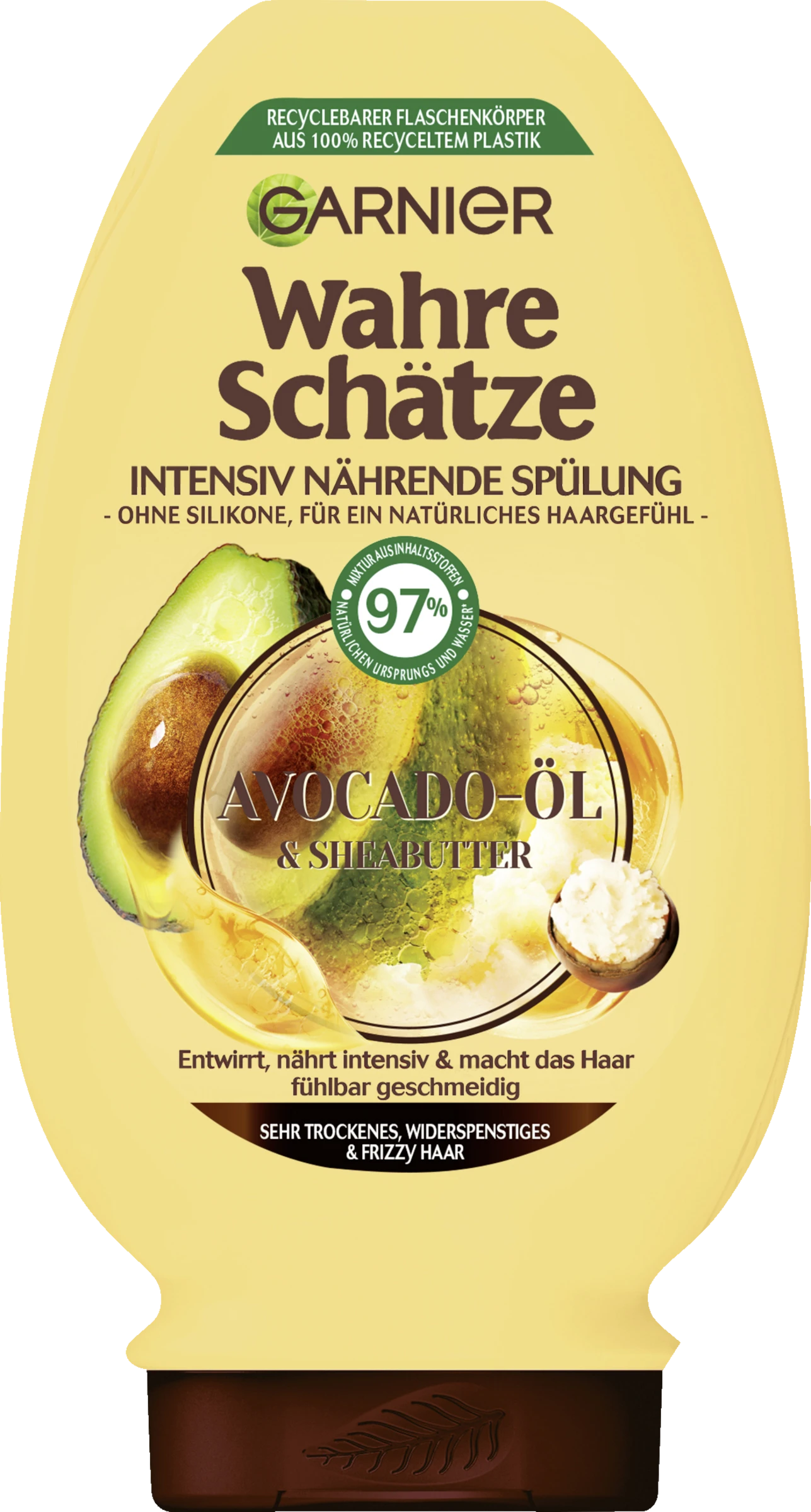 Garnier Wahre Schätze Intensiv Nährende Spülung Avocado-Öl & Sheabutter nährt sehr trockenes Haar intensiv und macht es geschmeidig. Die Haare erhalten einen gesunden Glanz und sind leichter kämmbar.