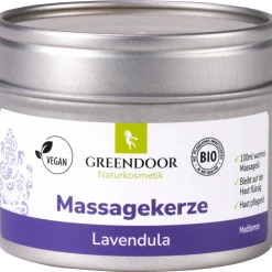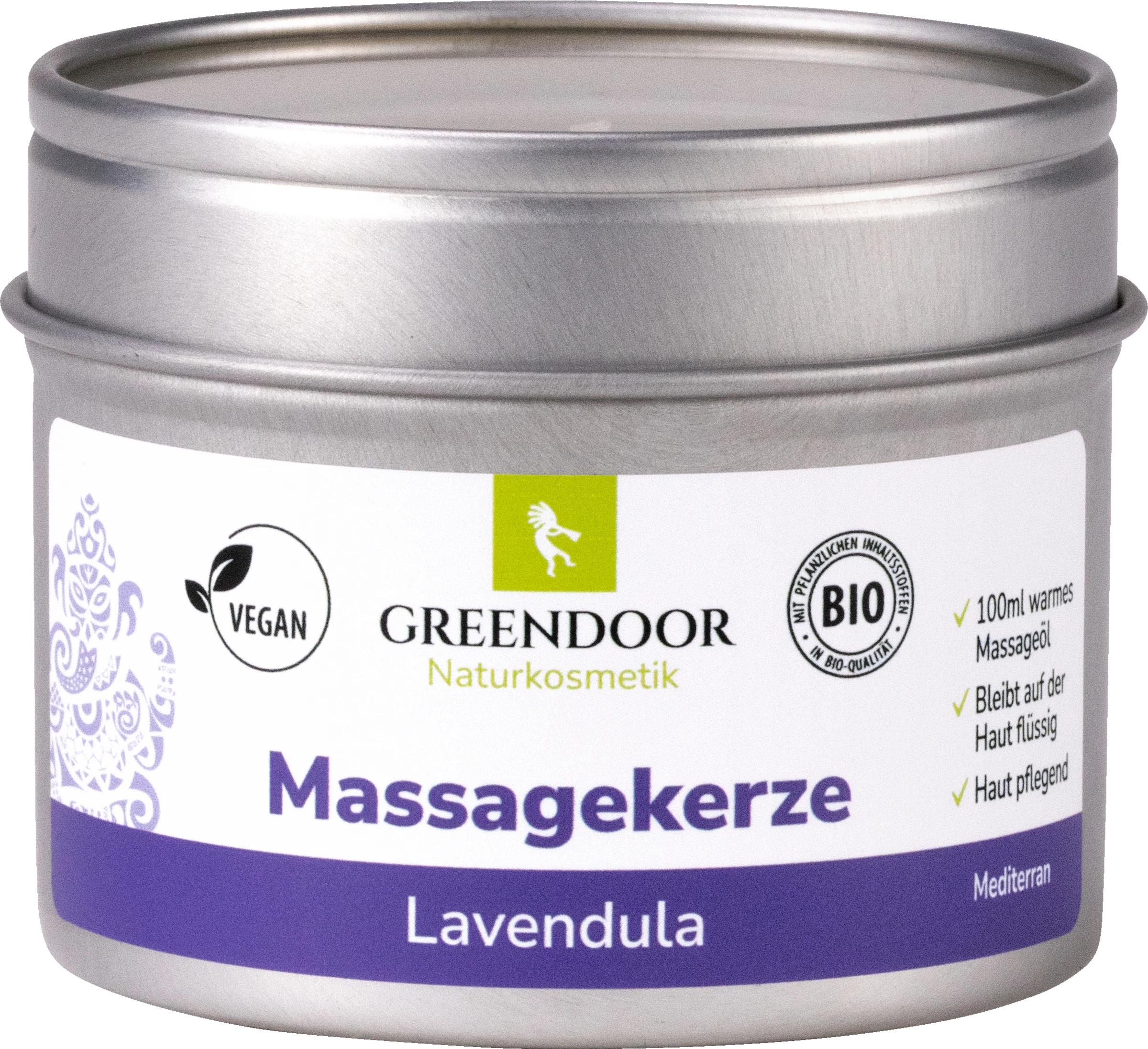 Mit dem warmen Wachs der GREENDOOR Massagekerze Lavendula zum außergewöhnlichen Massageerlebnis dank der wertvollen Öle und dem natürlichen Greendoor Rezepturgeheimnis. Nach 10-15 Minuten Zeit ist genug Wachs für eine Massage geschmolzen. Kerze löschen und das flüssige Wachs in die Handfläche gießen. Das Wachs einer GREENDOOR Massagekerze ist nur so warm, wie ein heißes Bad. Los geht’s mit der Massage! Das natürliche GREENDOOR Rezepturgeheimnis sorgt dafür, dass das entstehende Massageöl auf der Haut nicht mehr fest wird und bei der Massage in die Haut einzieht. Lavendel aus der Barreme fördert die Entspannung und beruhigt bei Nervosität. Die Anwendung von warmen Ölen bei der Massage entspannt verhärtete Muskelpartien besonders gut