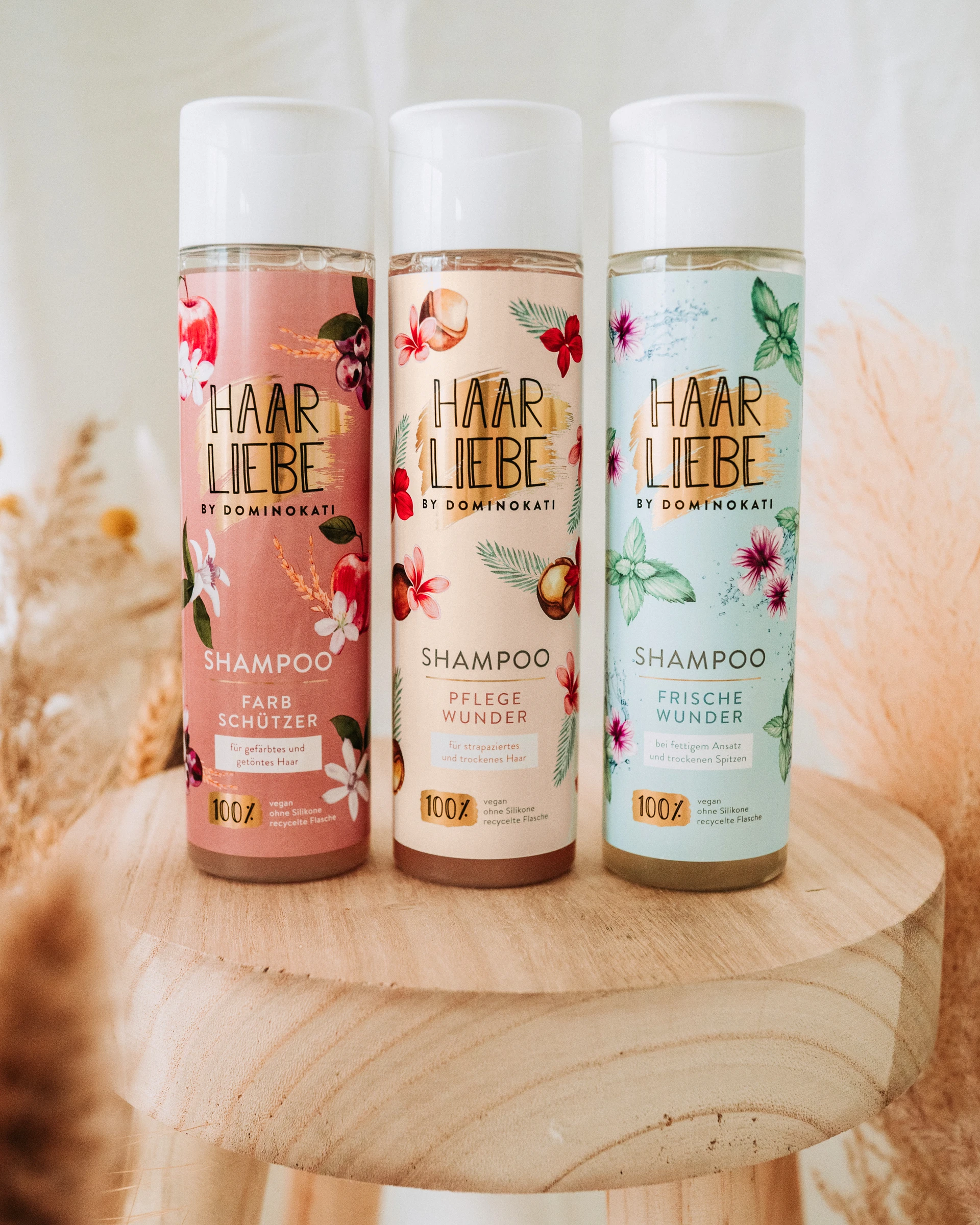 Die Haarliebe by DominoKati Farbpflegelinie ist ganz auf die besonderen Bedürfnisse von gefärbten und getönten Haaren abgestimmt und verleiht ihnen einen wundervoll natürlichen Farbglanz. Dabei verzaubert der sanft-fruchtige, cremige Duft bei jeder Haarwäsche.