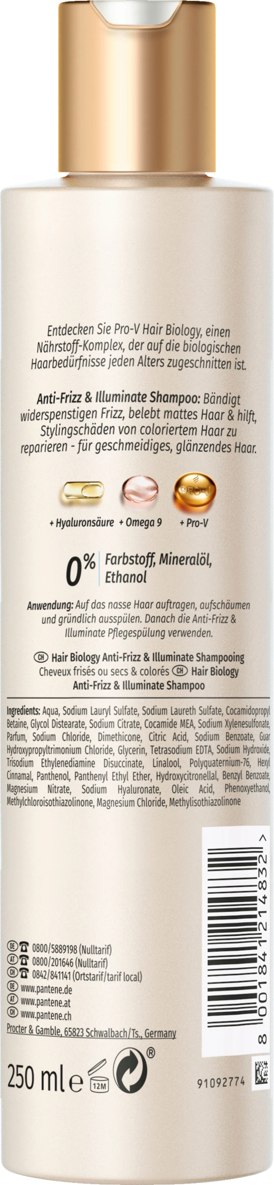 Auf das nasse Haar auftragen, aufschäumen und gründlich ausspülen. Danach die Anti-Frizz & Illuminate Pflegespülung verwenden.