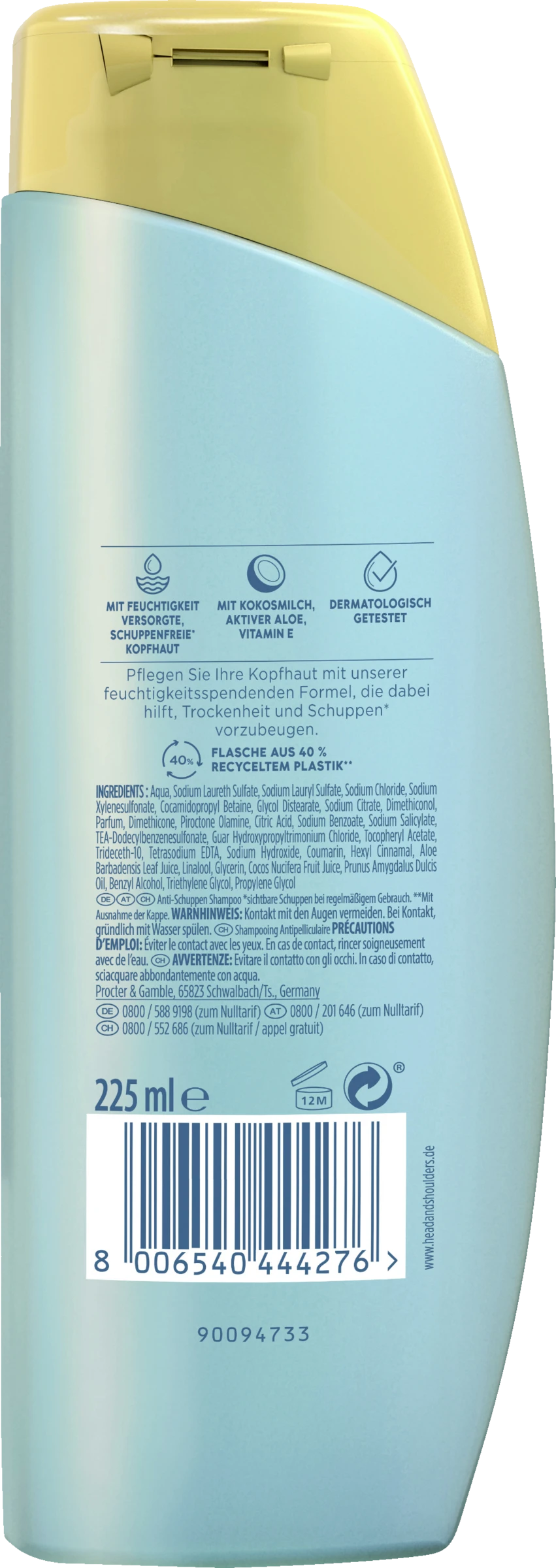 Aqua, Sodium Laureth Sulfate, Sodium Lauryl Sulfate, Sodium Chloride, Sodium Xylenesulfonate, Cocamidopropyl Betaine, Glycol Distearate, Sodium Citrate, Dimethiconol, Parfum, Dimethicone, Piroctone Olamine, Citric Acid, Sodium Benzoate, Sodium Salicylate, TEA-Dodecylbenzenesulfonate, Guar Hydroxypropyltrimonium Chloride, Tocopheryl Acetate, Trideceth-10, Tetrasodium EDTA, Sodium Hydroxide, Coumarin, Hexyl Cinnamal, Aloe Barbadensis Leaf Juice, Linalool, Glycerin, Cocos Nucifera Fruit Juice, Prunus Amygdalus Dulcis Oil, Benzyl Alcohol, Triethylene Glycol, Propylene Glycol