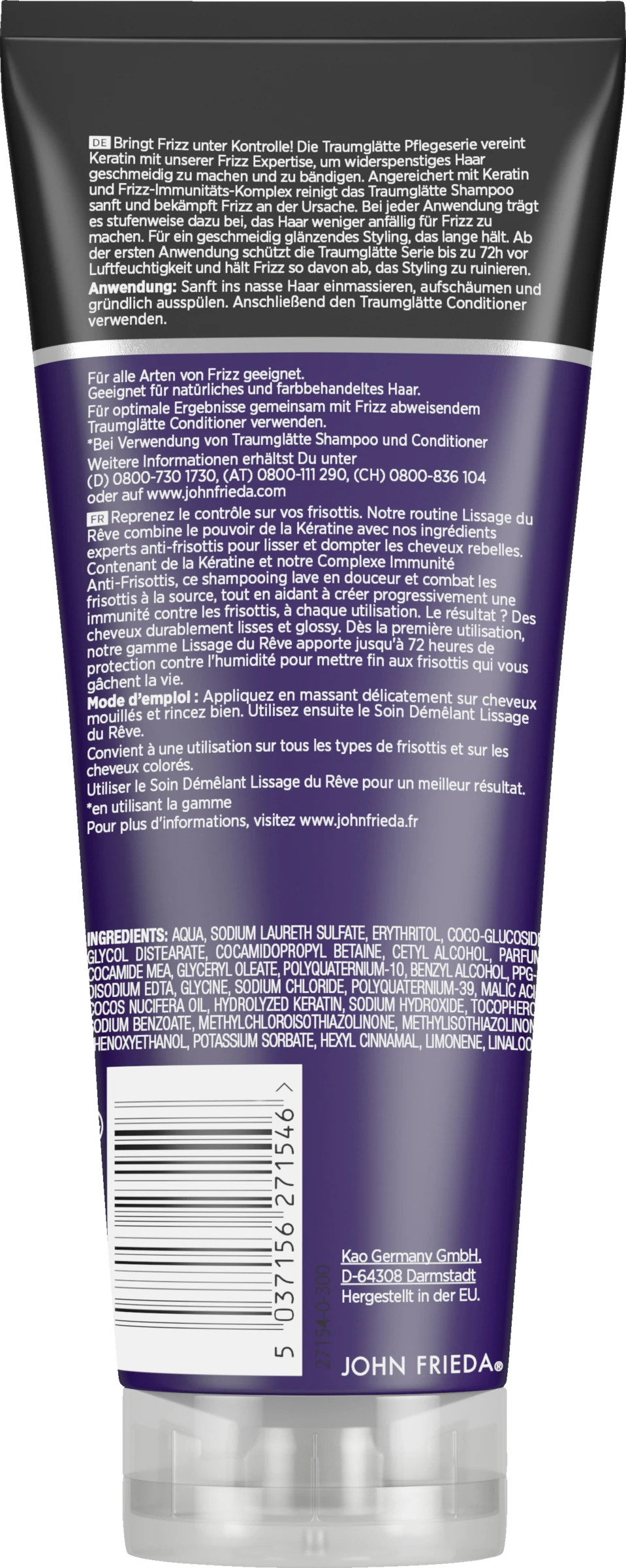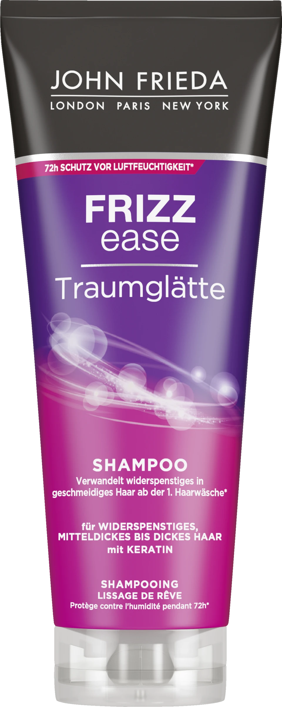 Bringt Frizz unter Kontrolle! Die Traumglätte Pflegeserie vereint Keratin mit der Frizz Expertise, um widerspenstiges Haar geschmeidig zu machen und zu bändigen. Angereichert mit Keratin und Frizz-Immunitäts-Komplex reinigt das Traumglätte Shampoo sanft und bekämpft Frizz an der Ursache. Bei jeder Anwendung trägt es stufenweise dazu bei, das Haar weniger anfällig für Frizz zu machen. Für ein geschmeidig glänzendes Styling, das lange hält. Ab der ersten Anwendung schützt die Traumglätte Serie bis zu 72h vor Feuchtigkeit und hält Frizz so davon ab, das Styling zu ruinieren.