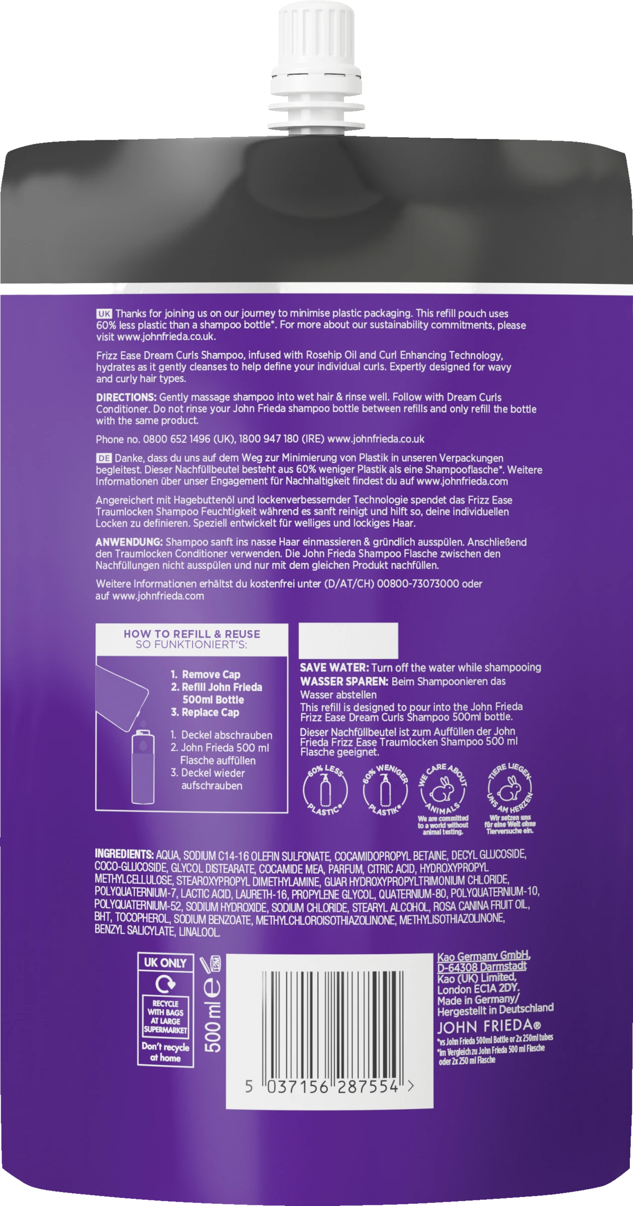Shampoo sanft ins nasse Haar einmassieren & gründlich ausspülen. Anschließend den Traumlocken Conditioner verwenden. Die John Frieda Shampoo Flasche zwischen den Nachfüllungen nicht ausspülen und nur mit dem gleichen Produkt nachfüllen. Dieser Nachfüllbeutel ist zum Auffüllen der John Frieda Frizz Ease Wunder-Reparatur Shampoo 500 ml Flasche geeignet.