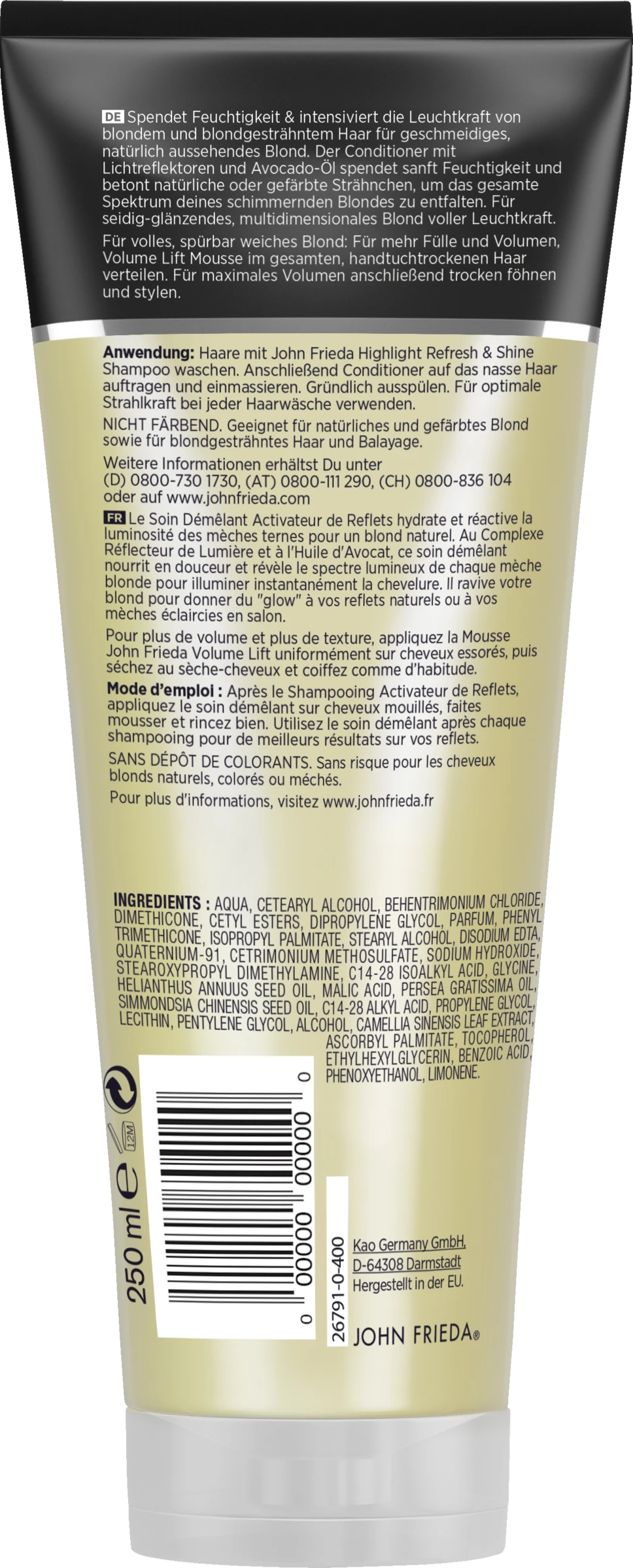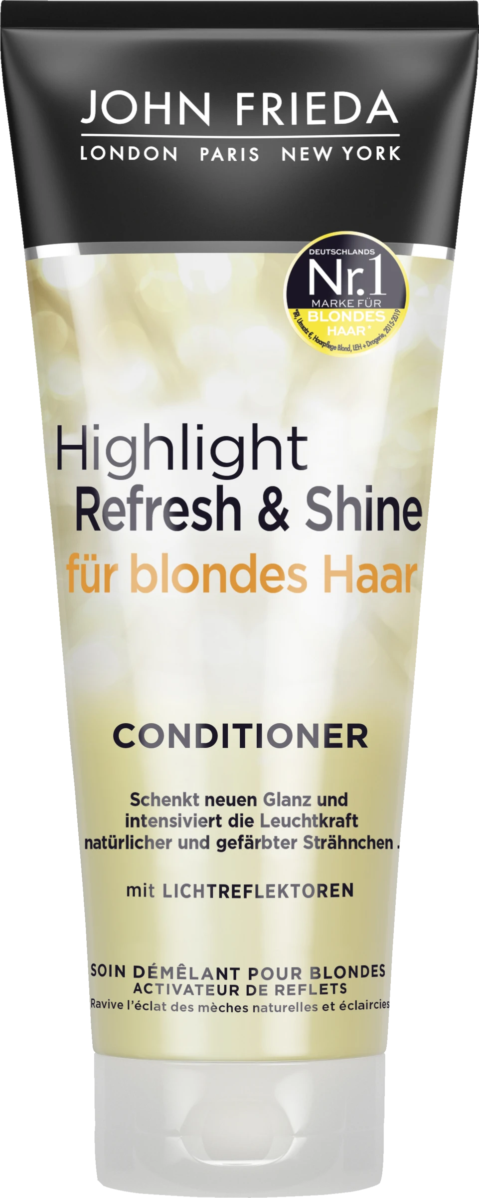 Haare mit John Frieda Highlight Refresh & Shine Shampoo waschen. Anschließend Conditioner auf das nasse Haar auftragen und einmassieren. Gründlich ausspülen.