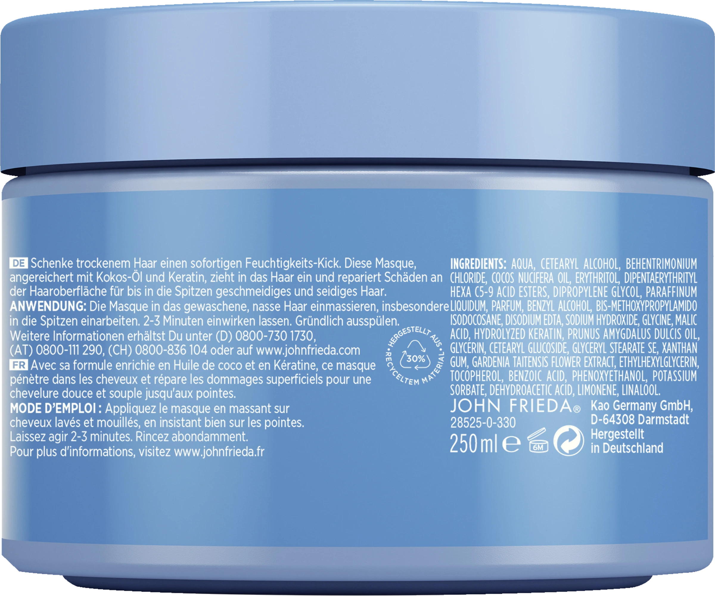 Schenke trockenem Haar einen sofortigen Feuchtigkeits-Kick. Diese Masque, angereichert mit Kokos-Öl und Keratin, zieht in das Haar ein und repariert Schäden an der Haaroberfläche für bis in die Spitzen geschmeidiges und seidiges Haar.