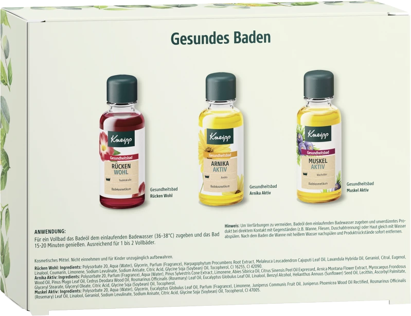 Rücken Wohl: Polysorbate 20, Aqua (Water), Glycerin, Parfum (Fragrance), Harpagophytum Procumbens Root Extract, Melaleuca Leucadendron Cajuputi Leaf Oil, Lavandula Hybrida Oil, Geraniol, Citral, Linalool, Eugenol, Limonene, Coumarin, Sodium Levulinate, Sodium Anisate, Citric Acid, Glycine Soja (Soybean) Oil, Tocopherol, CI 16255, CI 42090.