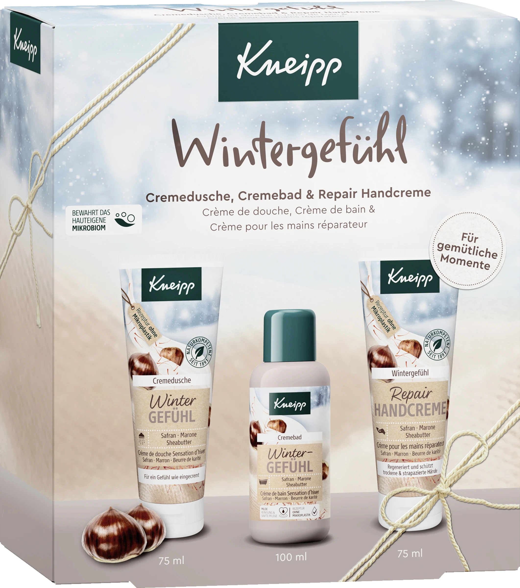 Das Kneipp® Wintergefühl Set eignet sich ideal als kleine Aufmerksamkeit in der Winterzeit und sorgt durch seinen angenehm warmen, pflegenden & luxuriösen Duft für Gemütlichkeit im Winter.