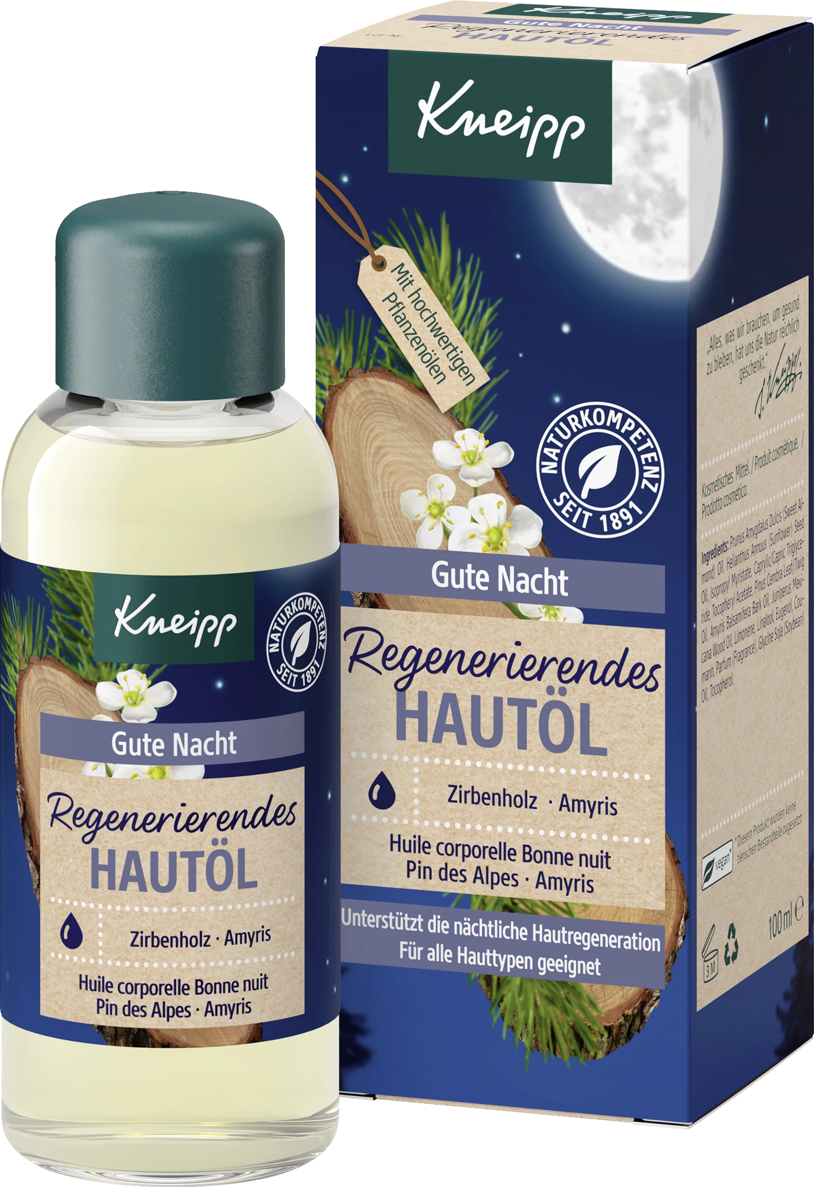 Entspannung am Abend für eine erholsame Nacht: Genieße dein Kneipp® Abendritual und bereite dich mit dem Kneipp® Hautöl Gute Nacht auf erholsamen Schlaf vor. Das regenerierende Hautöl mit ätherischen Ölen aus Zirbenholz und Amyris unterstützt die nächtliche Hautregeneration und nährt die Haut intensiv. Mit beruhigendem, warm-holzigem Duft schenkt es Dir Ruhe und lässt Dich schneller einschlafen, um erholt aufzuwachen. Gute Nacht – besserer Morgen!