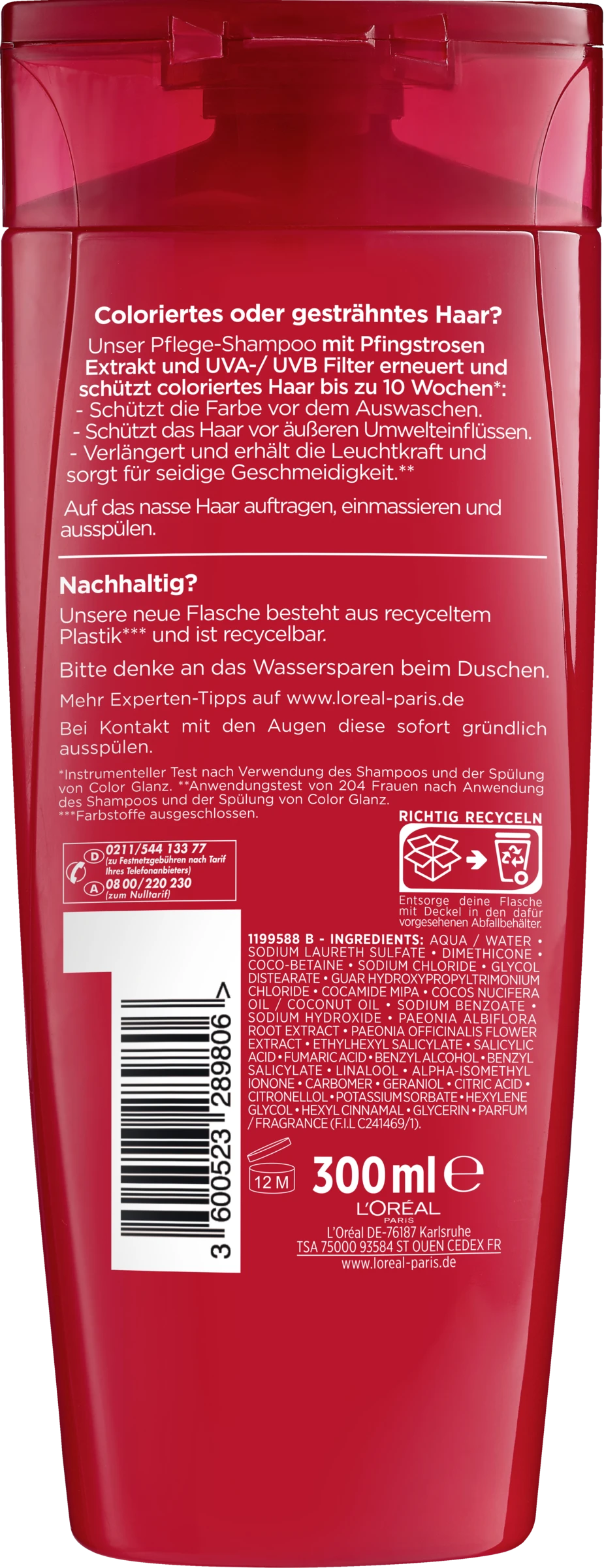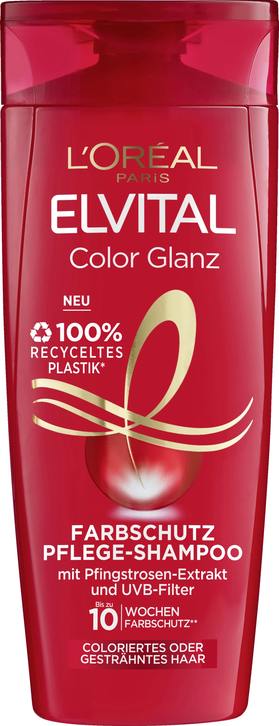 L’Oreal Paris Elvital Color-Glanz Pflege-Shampoo pflegt coloriertes Haar und erhält die Leuchtkraft der Farbe.Coloriertes, getöntes oder gesträhntes Haar ist besonders sensibel gegenüber äußeren Einflüssen. So führen z. B. regelmäßiges Haare-Waschen oder UV-Strahlen dazu, dass die Farbe verblasst, sich verändert und schnell an Leuchtkraft und Farbintensität verliert.Das L’Oreal Paris Elvital Color-Glanz Pflege-Shampoo schützt die Schönheit der Haarfarbe mit einer besonderen 3-fach-Wirkung:Intensiver Farbschutz: Dank eines hochwertigen Farbschutz-Elixiers wird die Farbe vor dem Auswaschen geschützt und die Farbintensität erhalten.Schutz vor UV-bedingtem Ausbleichen: Wirksame UVA-/UVB-Filter schützen das Haar vor den schädlichen Sonnenstrahlen und helfen, die Haarfarbe zu erhalten.Verlängerte Leuchtkraft: Das spezielle Elvital Nutri-Konzentrat pflegt das Haar intensiv und glättet die Haaroberfläche. Dadurch wird die Leuchtkraft intensiviert und verlängert.So bleibt die Haarfarbe leuchtend und strahlend – bis zu 10 Wochen lang.Ideal für die Pflege von coloriertem Haar ist ein perfekt aufeinander abgestimmtes Color-Glanz-Pflegesystem. Dazu gehört die L’Oreal Paris Elvital Color-Glanz Pflege-Spülung. Sie pflegt das Haar zusätzlich und erleichtert das Kämmen.