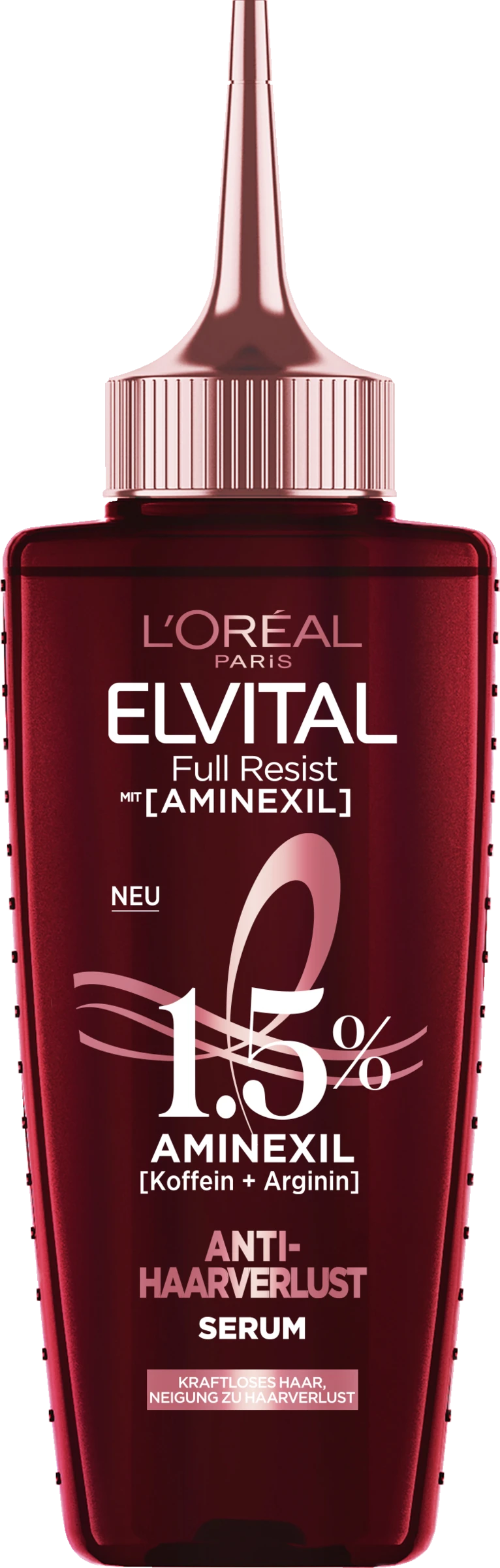 Das Elvital Full Resist Anti-Haarverlust Serum von L’Oréal Paris ist ein Haarserum für kraftloses Haar, mit der Neigung zu Haarverlust. Dank seiner reichhaltigen Formel stärkt das Serum das Haar direkt an der Haarwurzel und reduziert so, durch eine wissenschaftliche Studie bewiesen, den Haarausfall bei Frauen. Angereichert mit 1,5 % Aminexil unterstützt das Serum gegen Haarverlust von L’Oréal Paris zudem das natürliche Wachstum der Haare. Für mehr Fülle und gesünder aussehendes Haar.