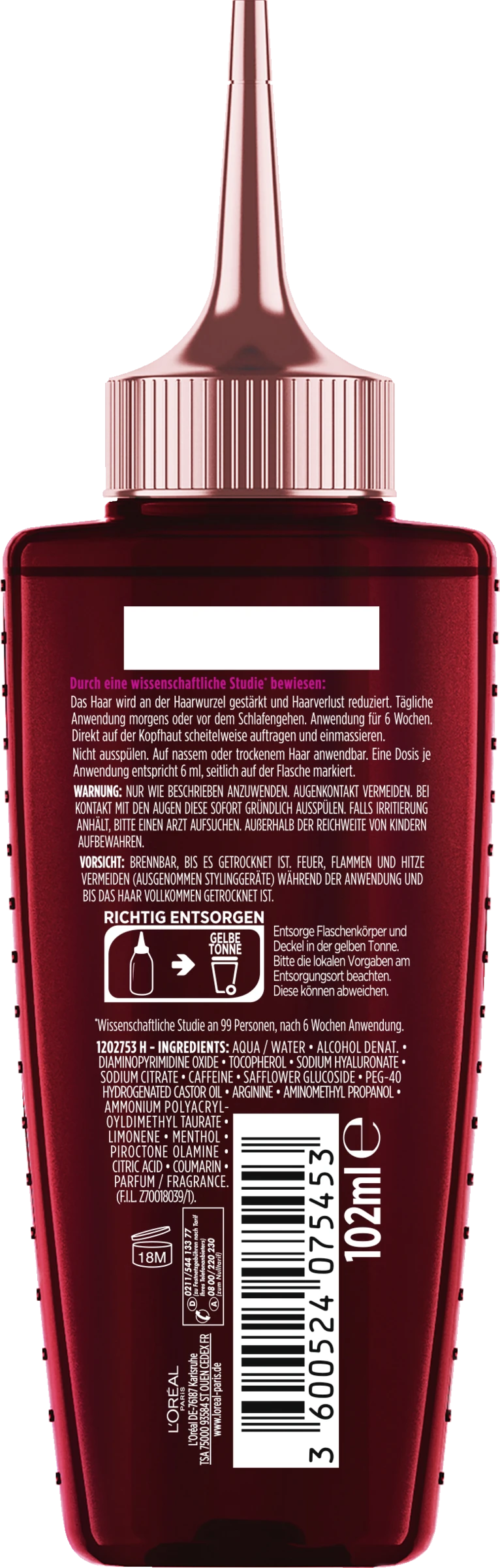 Das Elvital Serum bei Haarverlust direkt auf die trockene oder nasse Kopfhaut scheitelweise auftragen und einmassieren. Nicht ausspülen. Eine Dosis je Anwendung entspricht 6 ml des Produktes gegen Haarausfall, seitlich auf der Flasche markiert.