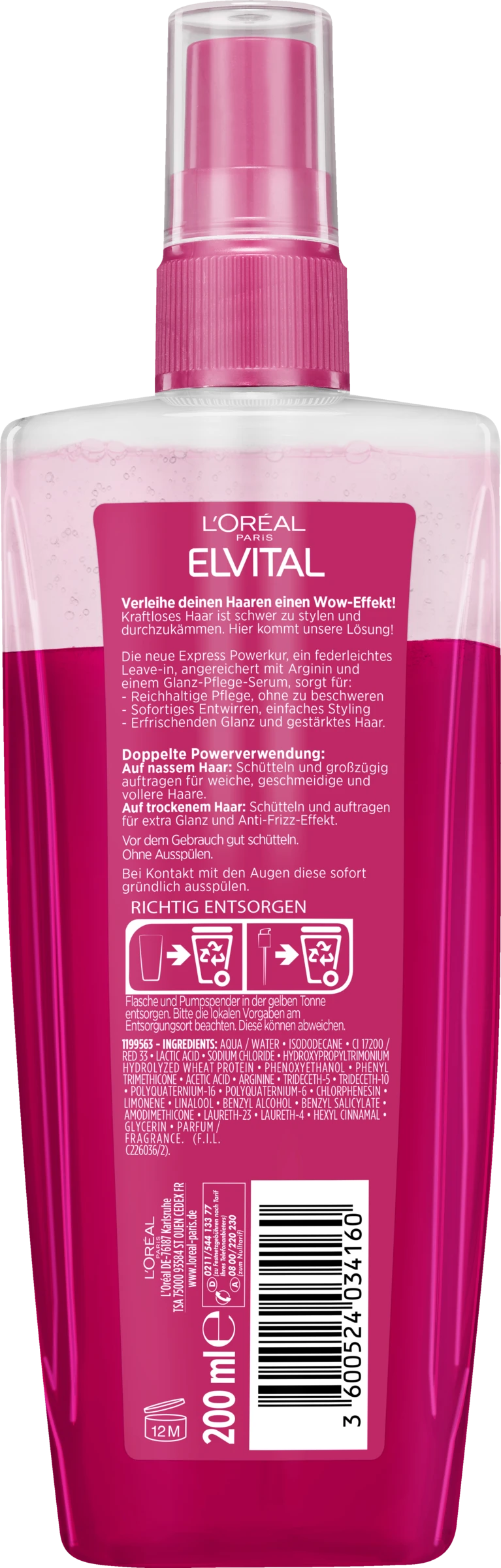 Die Elvital Full Resist Express Powerkur zum sprühen mit Wow-Effekt. Ein federleichtes Leave-in, sorgt für Extra Glanz und eine reichhaltige Pflege – ohne zu beschweren. Angereichert mit Arginin und einem Glanz-Pflege-Serum entwirrt es das Haar sofort und lässt sie einfacher stylen. Der blumige Duft begleitet dich den ganzen Tag. Die Sprühkur verleiht eine leichte Kämmbarkeit und das Haar wird sofort gekräftigt.