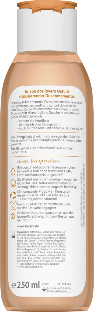 Erlebe das lavera Gefühl vitalisierender Duschmomente: Unsere pH-hautneutrale Formel mit milden Tensiden reinigt besonders sanft und schont dabei deine Hautflora. Zugleich verwandelt der sonnig-frische Orangenduft deine tägliche Dusche in ein vitalisierendes Wohlfühlerlebnis.