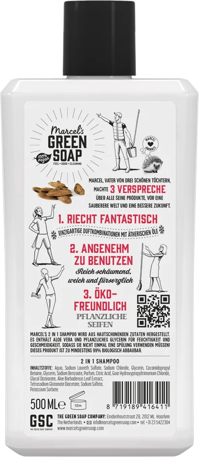 Marcel’s 2in1 Shampoo ist mit haarschonenden Inhaltsstoffen hergestellt. So wird jeder Tag zum Good Hair Day. Es enthält Aloe Vera und pflanzliches Glycerin für Feuchtigkeit und Geschmeidigkeit, sodass Sie nicht einmal eine Spülung verwenden müssen!