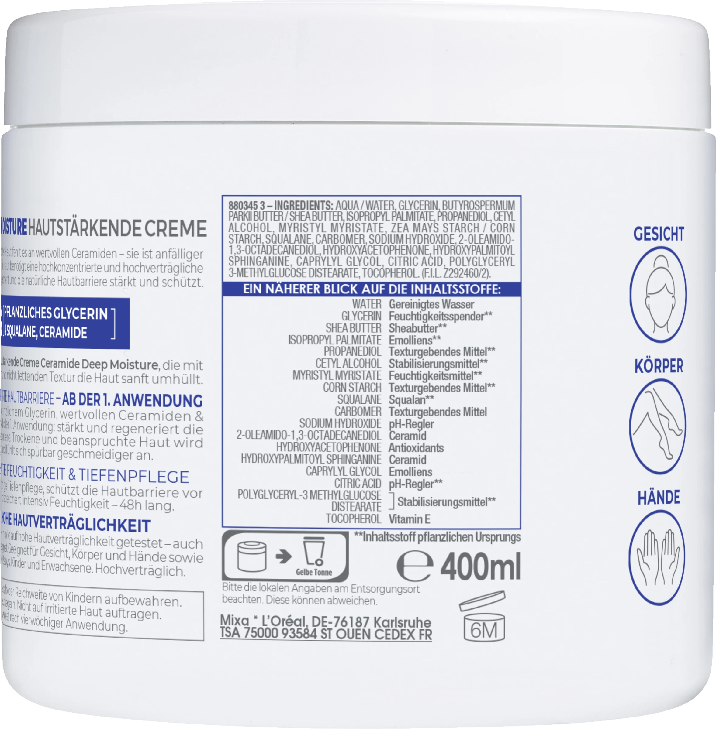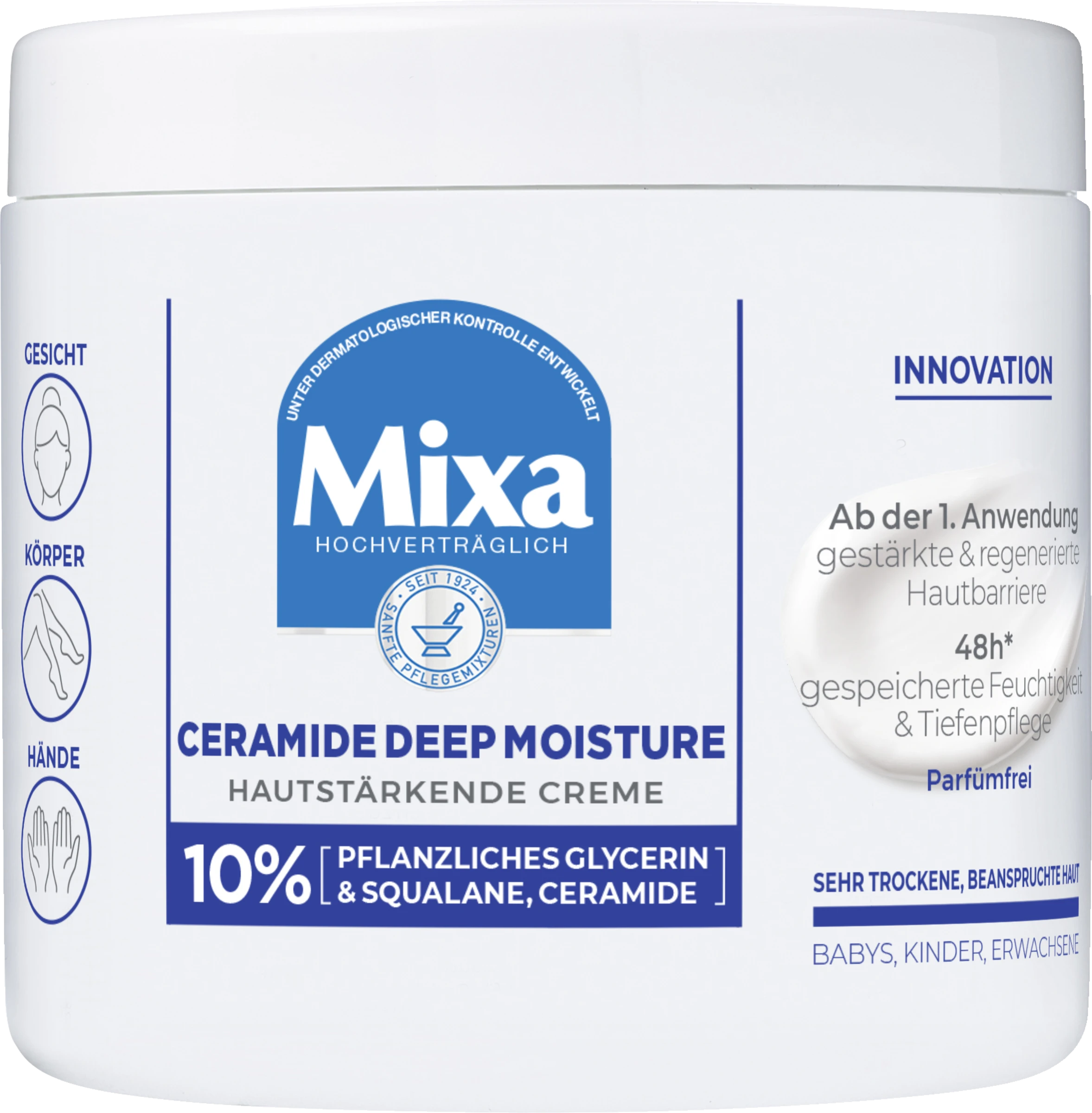 Entdecken Sie die neue hautstärkende Creme Ceramide Deeo Moisture, die mit ihrer schnell einziehenden und nicht fettenden Textur die Haut sanft umhüllt.Die Ceramide Deep Moisture Hautstärkende Creme von Mixa pflegt sehr trockene und beanspruchte Haut am Körper, im Gesicht sowie an den Händen. Die Creme für Babys, Kinder und Erwachsene ist eine hochkonzentrierte und hochverträgliche Pflege, welche Feuchtigkeit speichert und die natürliche Hautbarriere schützt. Dafür enthält sie 10 % pflanzliches Glycerin, Squalane und Ceramide, die regenerierend wirken und die Haut tiefenwirksam mit Feuchtigkeit versorgen. Die schnell einziehende und nicht fettende Textur schützt vor dem Austrocknen und umhüllt die Haut sanft – für ein geschmeidiges und wohltuendes Gefühl bereits nach der ersten Anwendung.