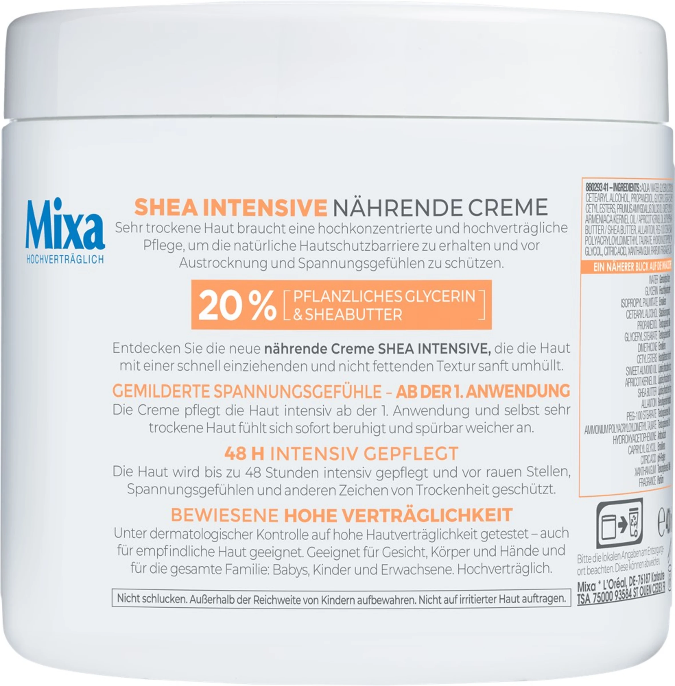 Entdecken Sie die neue Shea Intensive Nährende Creme für die ganze Familie. Angereichert mit einem Mix aus 20% pflanzlichem Glycerin und Sheabutter umhüllt diese schnell einziehende und nicht fettende, reichhaltige Textur sanft die Haut von Gesicht, Körper und Händen. Die tiefenwirksame Pflegeformel beruhigt die Haut ab der ersten Anwendung und selbst sehr trockene Haut fühlt sich sofort geschmeidig an. Die Haut wird bis zu 48 Stunden lang intensiv gepflegt und vor rauen Stellen, Spannungsgefühlen und anderen Zeichen von Trockenheit geschützt.