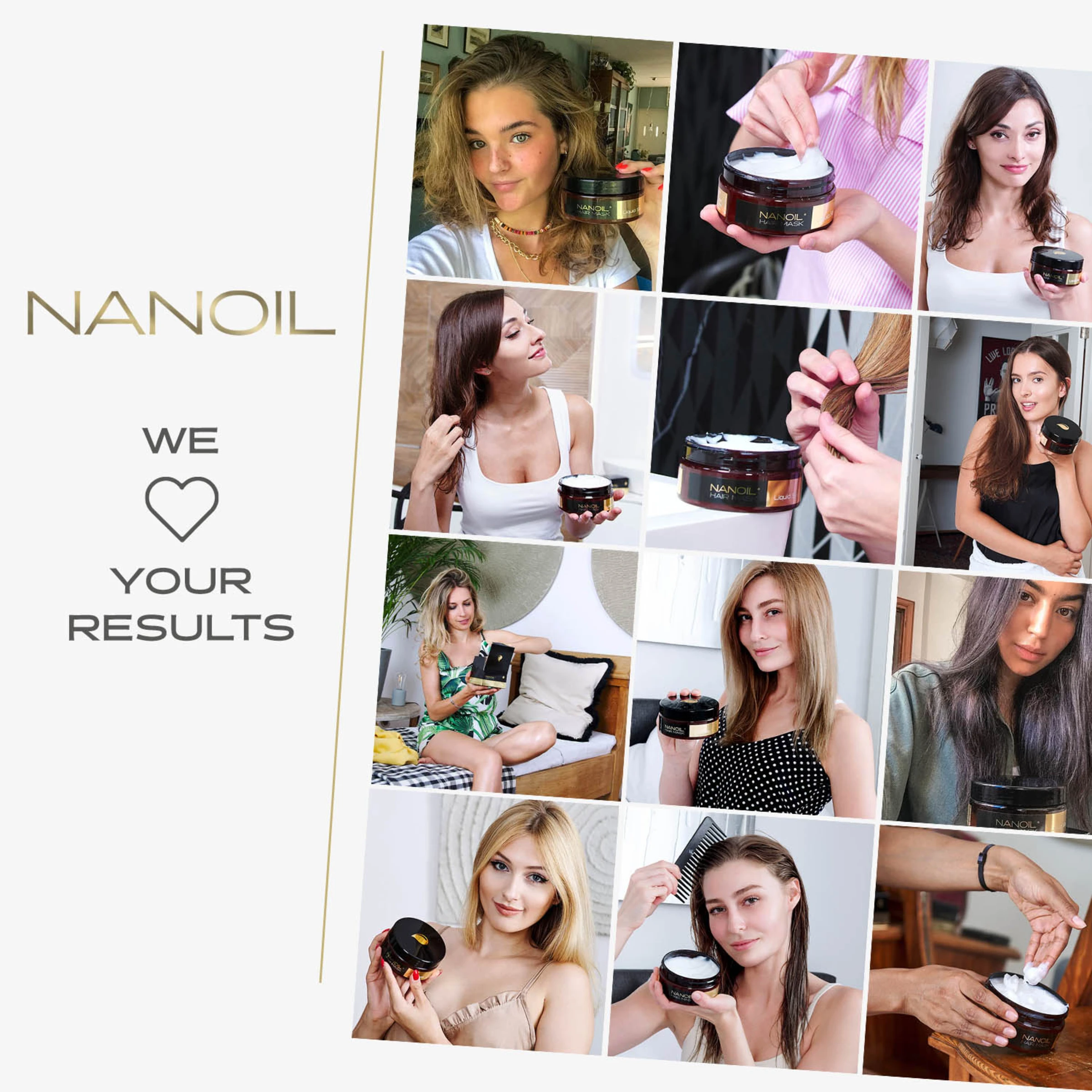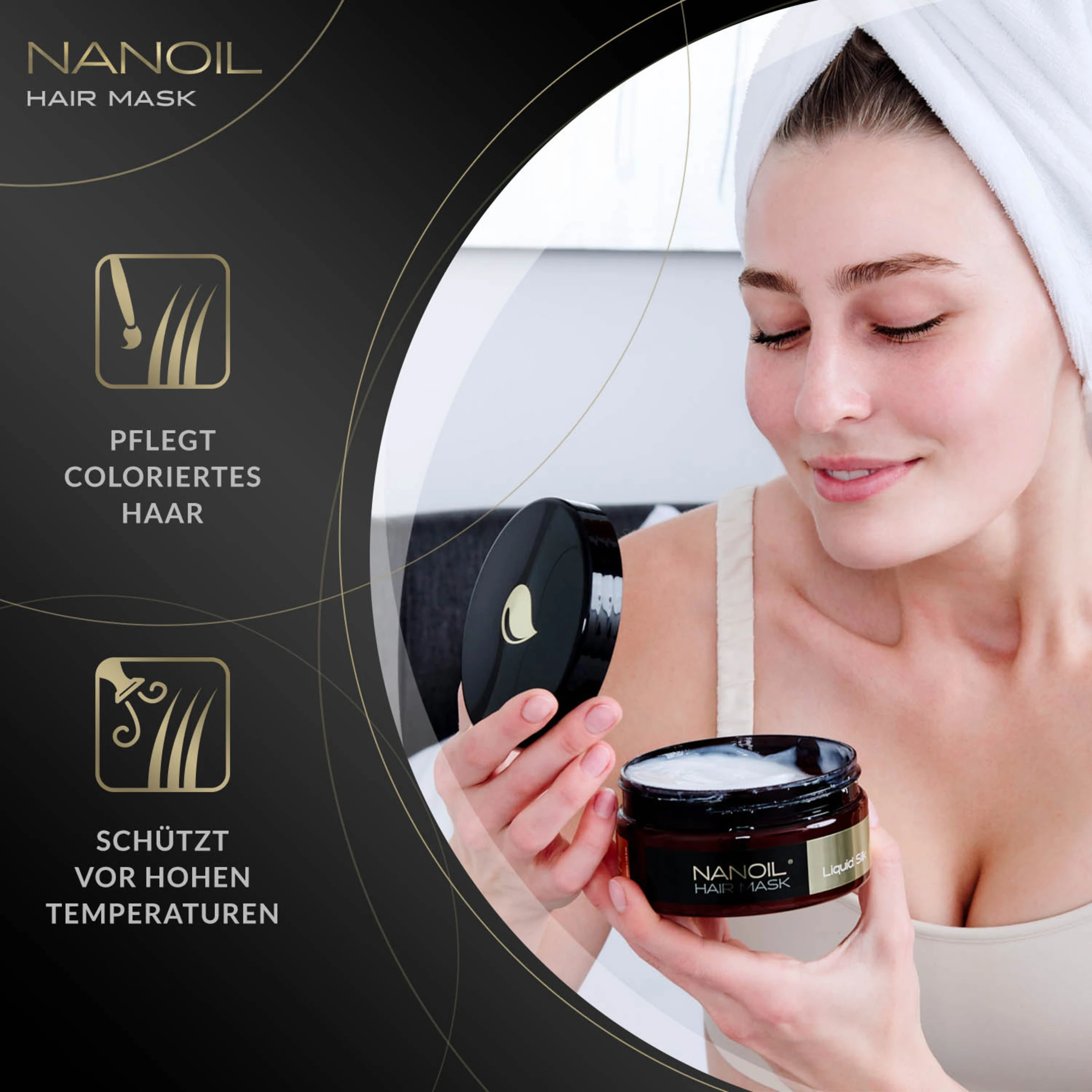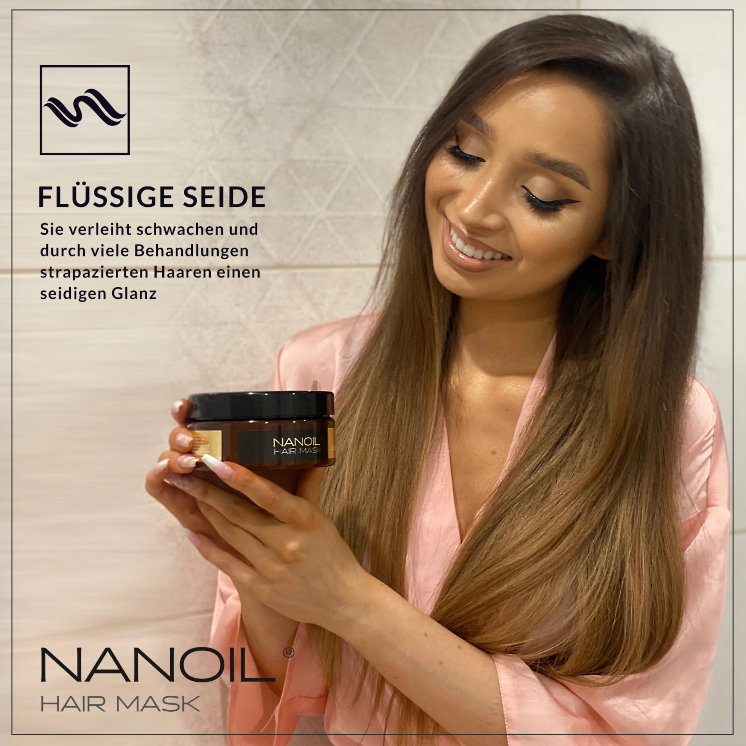 NANOIL Haarmaske mit flüssiger Seide – Kraft der Seidenproteine für Ihre wunderschöne FrisurDie glättende Haarmaske von Nanoil enthält hochwertige Inhaltsstoffe, die Ihren Haaren eine professionelle Kur zu Hause sichern: