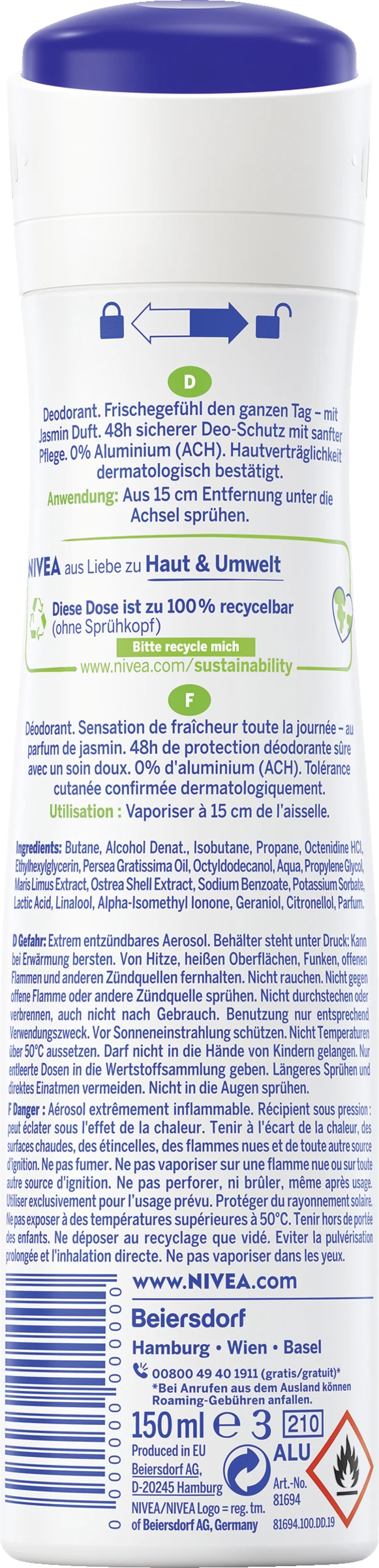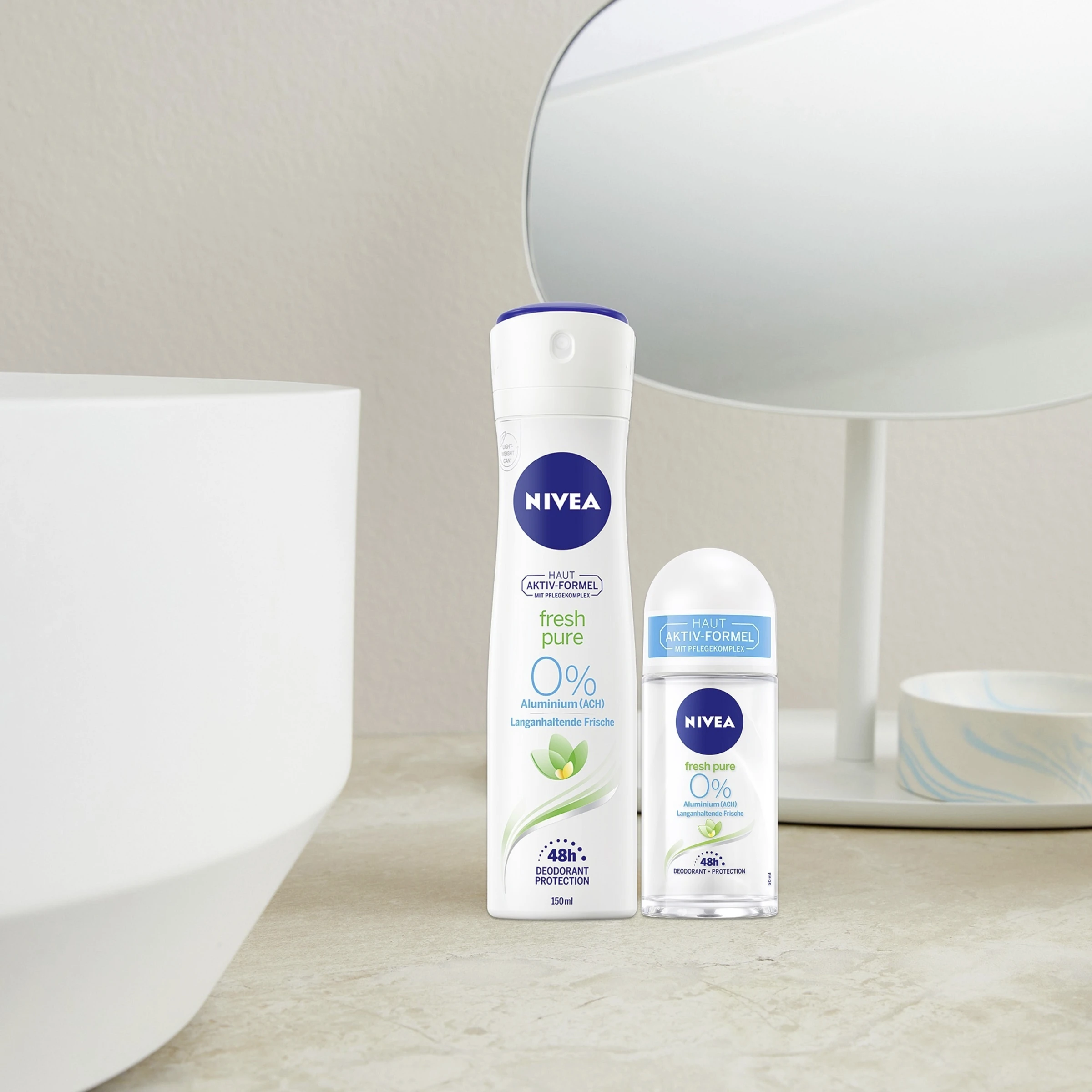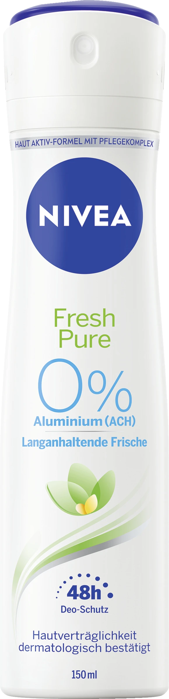 NIVEA Deo Fresh Pure Spray bietet 48 Stunden lang zuverlässigen Deo-Schutz ohne Aluminium (ACH). Die erfrischende Formel mit antimikrobiellen Wirkstoffen lässt die Haut frei atmen und verspricht die optimale Kombination aus NIVEA®-Pflege und wirksamem Schutz vor Körpergeruch und sorgt für ein angenehmes Hautgefühl – den ganzen Tag.