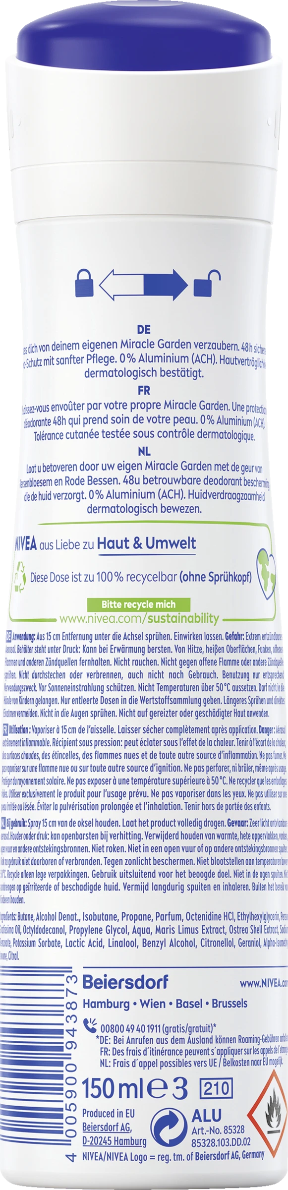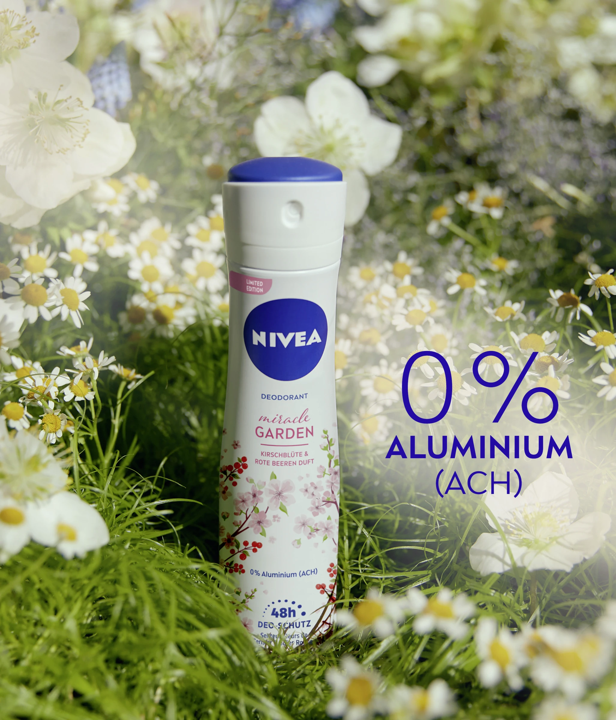 Das NIVEA Miracle Garden Kirschblüte Deo Spray gibt dir ein trockenes und frisches Hautgefühl mit dem Duft nach Kirschblüte & rote Beeren. Das Produkt bietet einen effektiven und sicheren Schutz ohne Aluminium (ACH) – und das 48 Stunden lang. Die Limited Edition sorgt mit der sanften Formel für langanhaltende Pflege und verleiht einen frischen, blumigen Duft. Die Hautverträglichkeit ist dermatologisch bestätigt. Nimm dir einen Moment für dich selbst: NIVEA Miracle Garden Kirschblüte Deo Spray.