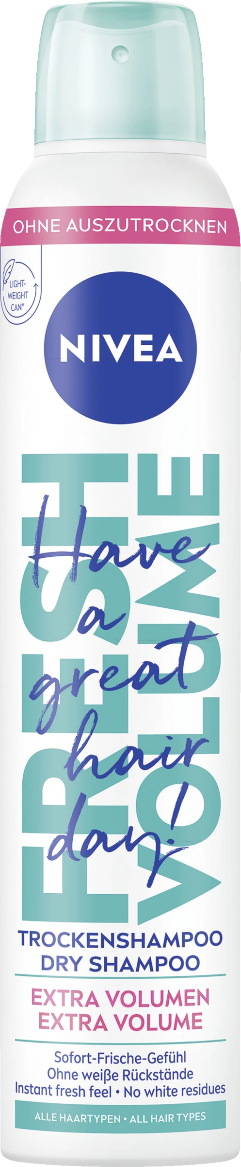 Nie wieder bad hair days! Das NIVEA Trockenshampoo Fresh Volume ist die perfekte Lösung: Es verleiht dem Haar extra Volumen & Griffigkeit und sorgt sofort nach der Anwendung für ein langanhaltendes Frischegefühl und einen angenehmen Duft. Ohne weiße Rückstände und ohne das Haar auszutrocknen.