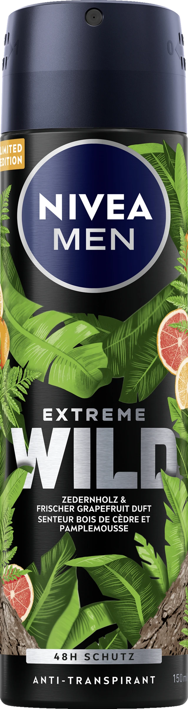 Entdecke deine wilde Seite – mit EXTREME WILD Zedernholz von NIVEA MEN. Das Deo Spray bietet zuverlässigen 48h Anti-Transpirant-Schutz und pflegt dabei deine Haut. Das Limited Edition Deo ist frei von Ethylalkohol und trocknet schnell auf deiner Haut. Der maskuline Duft nach Zedernholz & frischer Grapefruit erfrischt deine Haut und Sinne. Die Hautverträglichkeit ist dermatologisch bestätigt.