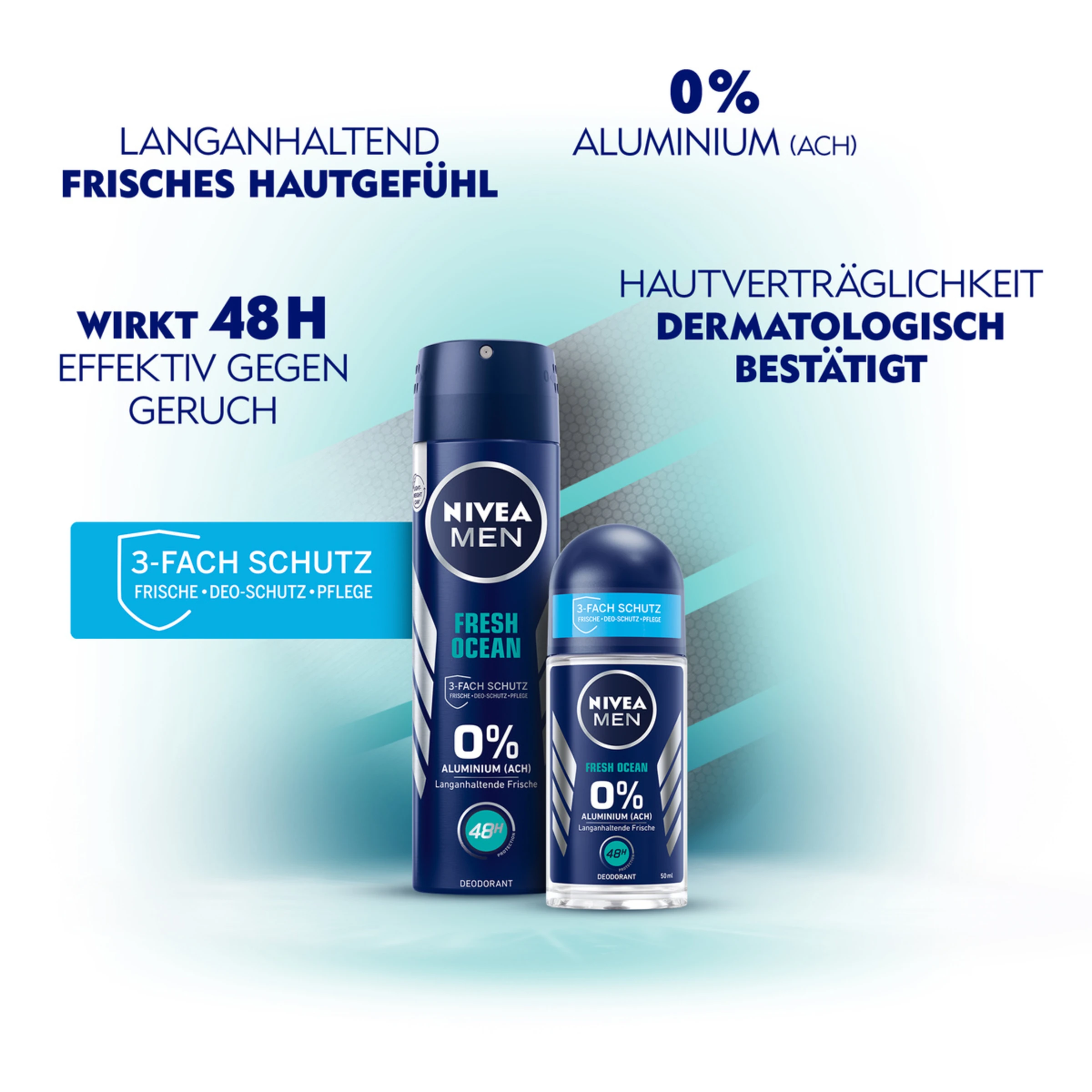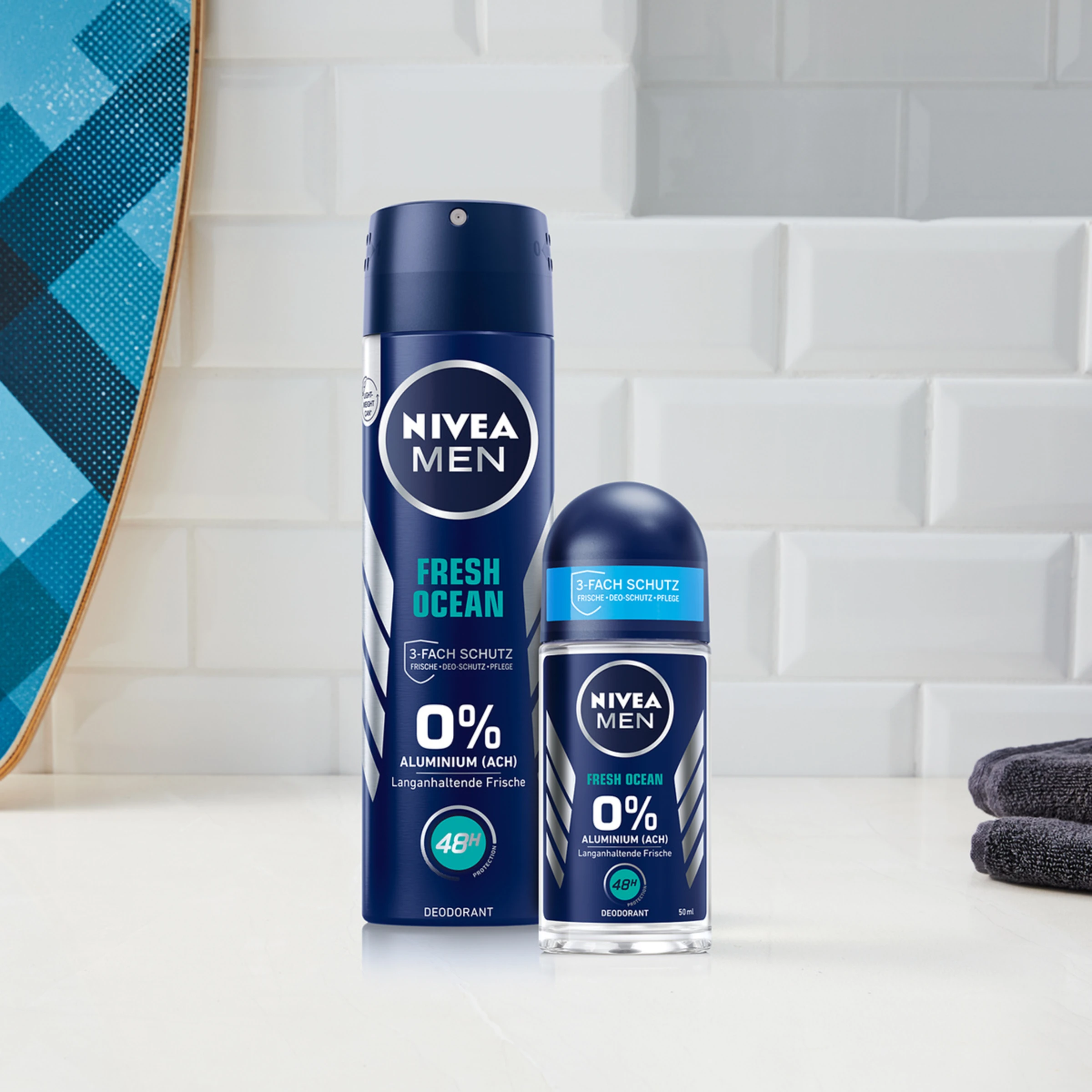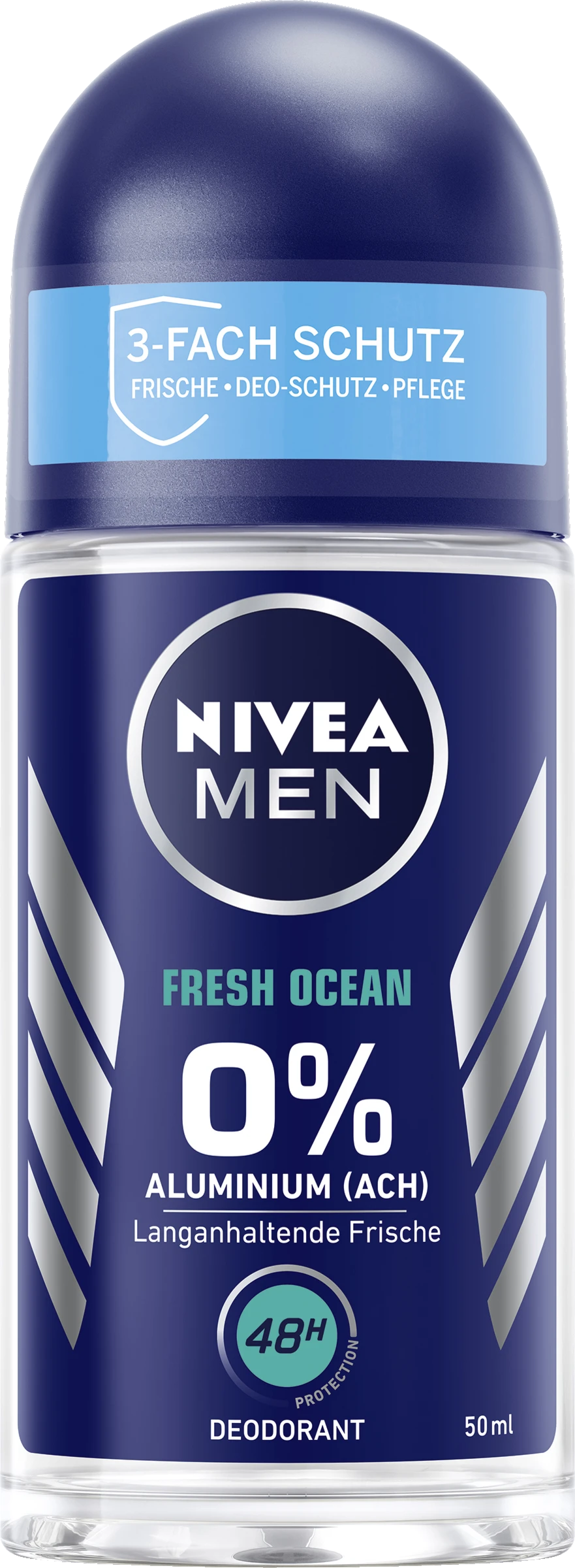 NIVEA MEN Fresh Ocean Roller bietet 48 Stunden lang zuverlässigen Deo-Schutz ohne Aluminium (ACH). Die erfrischende Deodorant Formel mit frischem Meeresduft enthält den bewährten NIVEA MEN Pflege-Komplex mit hocheffektiven, anti-bakteriellen Wirkstoffen und verspricht damit die optimale Kombination aus NIVEA-Pflege und wirksamem Schutz vor Körpergeruch. Für Männer, die langanhaltende Frische erwarten.