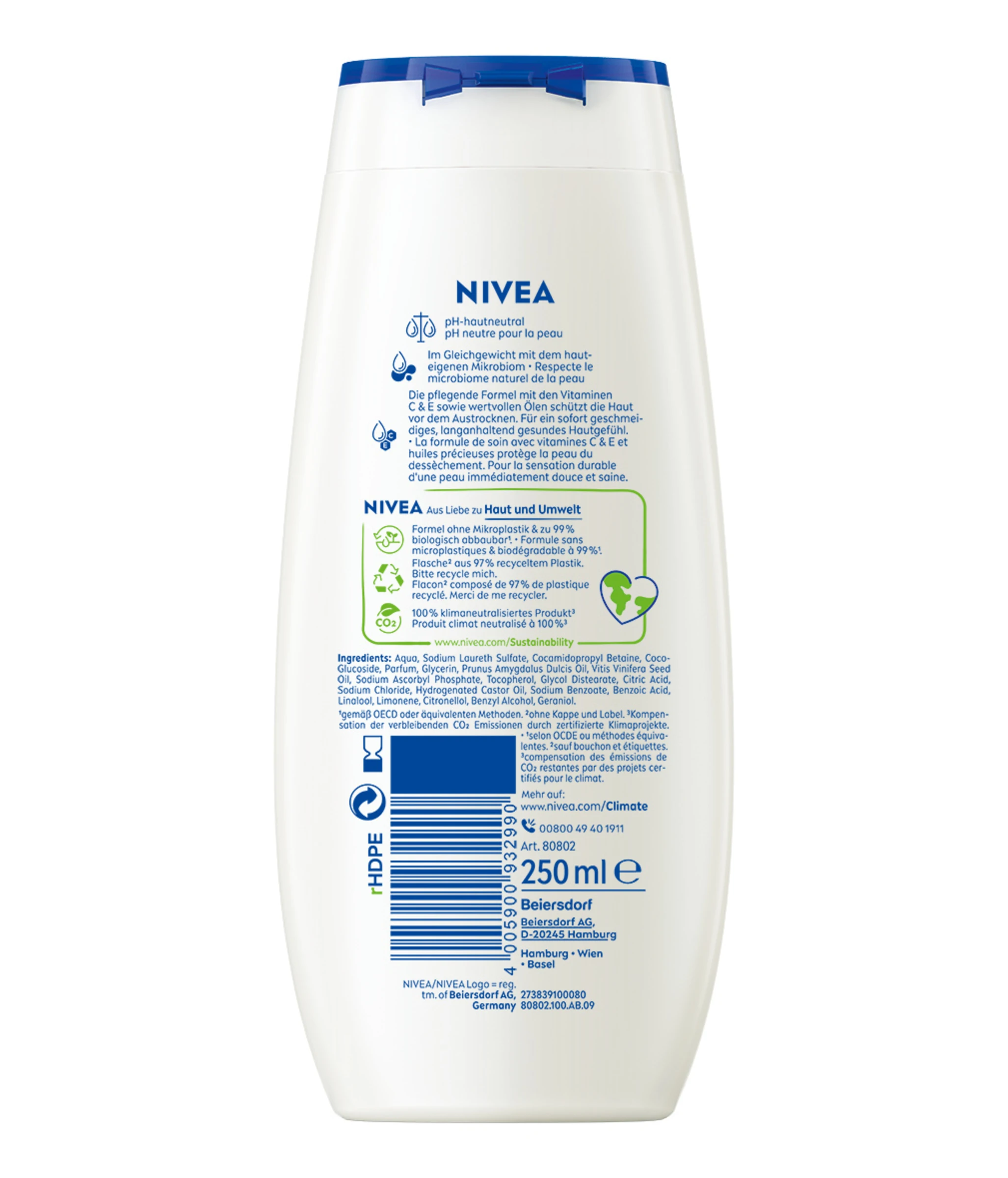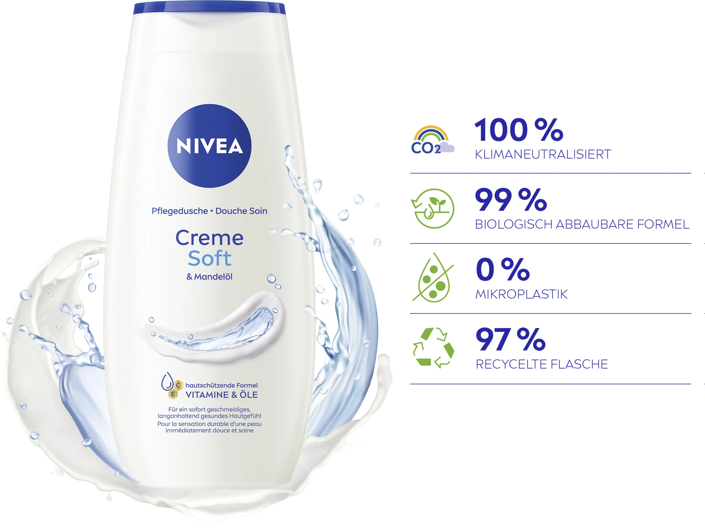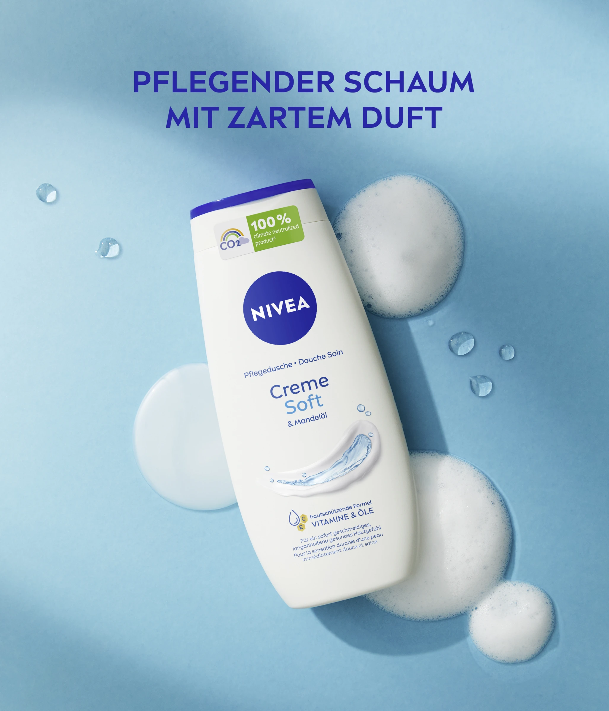 Entdecken Sie ein geschmeidiges Hautgefühl mit der NIVEA Creme Soft Pflegedusche. Spüren Sie, wie das seidige Duschgel dank seiner Formel mit natürlichem Mandel-Öl, Ölen & Vitamine C & E Ihre Haut sanft unter der Dusche pflegt. Genießen Sie den samtweichen, cremigen Schaum und den zarten Duft. Dieses Duschgel ist zu 100% klimaneutralisiert und tut damit nicht nur deiner Haut, sondern auch der Umwelt etwas Gutes. Die Formel ist zu 99% biologisch abbaubar und enthält kein Mikroplastik. Die Flasche besteht zu 97% aus Recycling-Material, ohne Verschluss und Label. Verwandeln Sie jedes Duscherlebnis in einen verwöhnenden Pflegemoment mit NIVEA – für ein geschmeidiges Hautgefühl: Creme Soft Pflegedusche.
