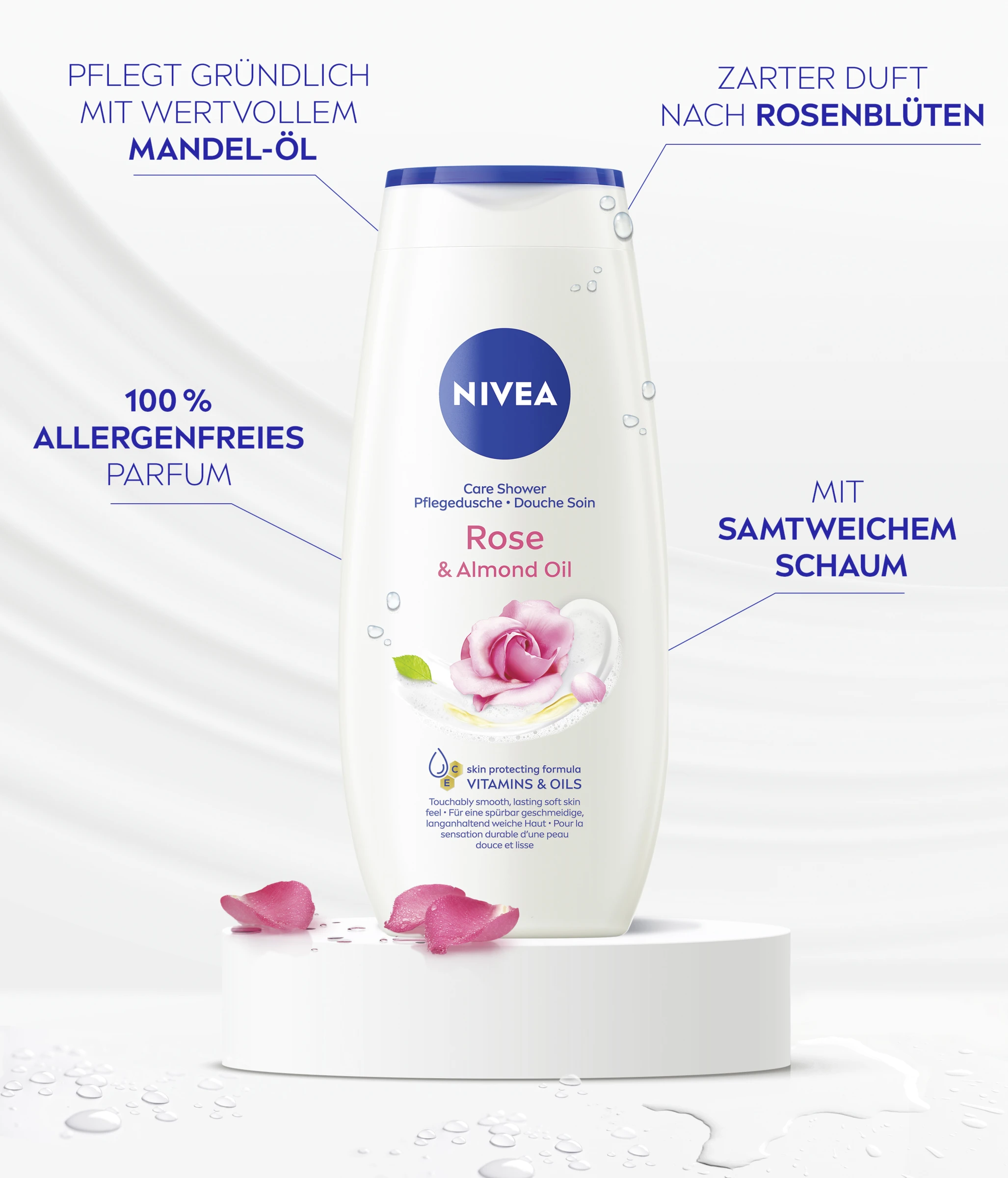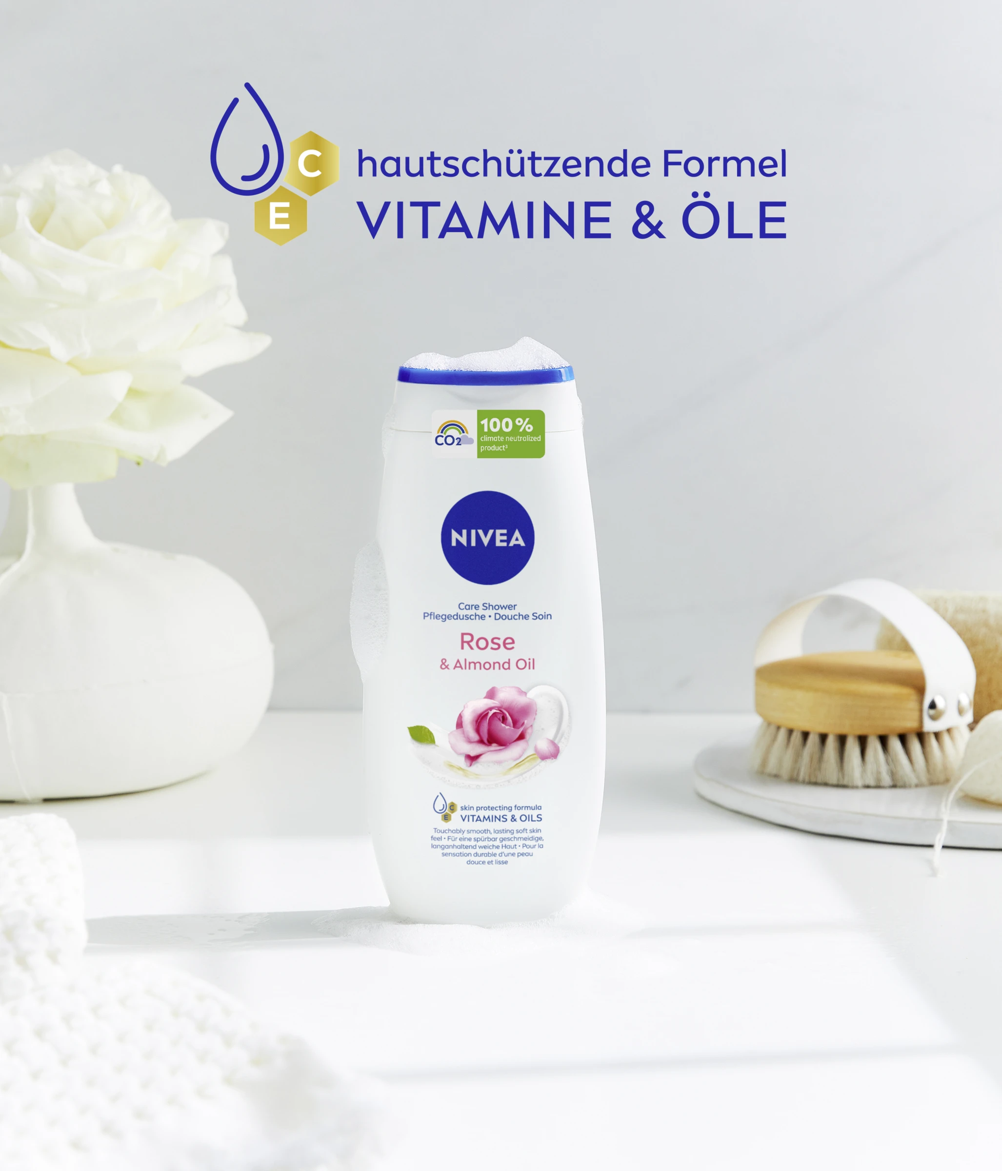 Entdecken Sie ein verwöhnendes Duscherlebnis mit dem cremigen NIVEA Rose Duschgel. Spüren Sie, wie die seidige Cremedusche Ihre Haut sanft reinigt und ihr dank der Formel mit wertvollem Ölen, Mandel-Öl und Vitamin C & E sanfte Pflege spendet. Genießen Sie den samtweichen Schaum auf Ihrer Haut und den zarten Rosen-Duft, der Ihre Sinne verwöhnt.