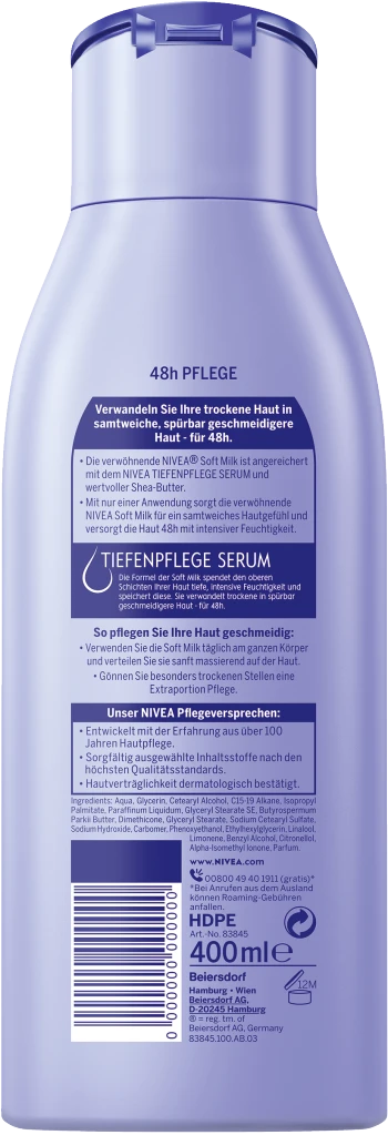 Für alle, die mehr als nur Feuchtigkeit von einer Body Lotion erwarten. Die NIVEA Verwöhnende Soft Milk bietet 3 in 1: 48h Pflege, Geschmeidigkeit und natürlich schöne Haut. Sie ist angereichert mit dem NIVEA TIEFENPFLEGE SERUM und wertvoller Shea-Butter, für verwöhnte, geschmeidige Haut. Mit nur einer Anwendung sorgt sie für ein samtweiches Hautgefühl und versorgt die Haut 48h mit intensiver Feuchtigkeit. Für einen Effekt den Sie nicht nur fühlen, sondern auch sehen können: NIVEA Verwöhnende Soft Milk.