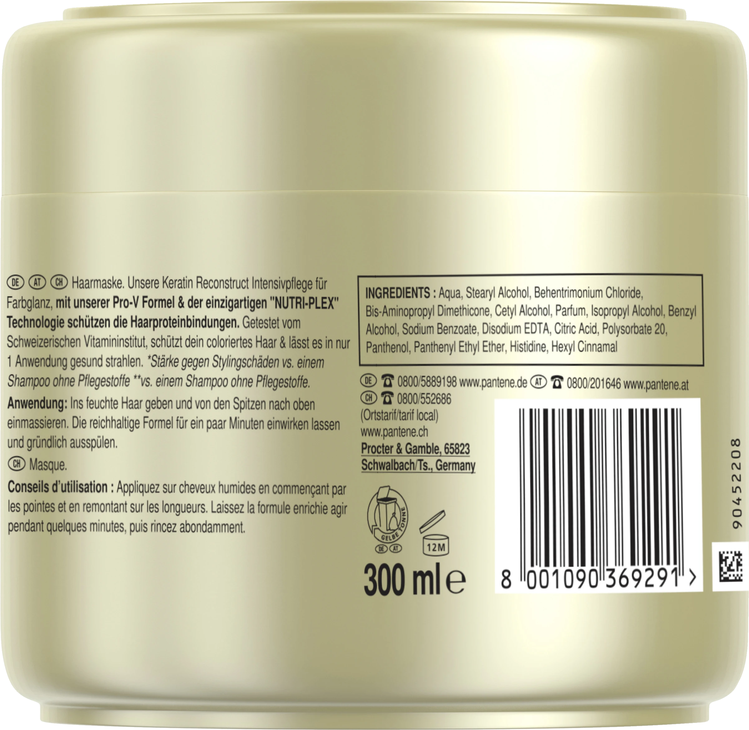 Aqua, Stearyl Alcohol, Behentrimonium Chloride, Bis-Aminopropyl Dimethicone, Cetyl Alcohol, Parfum, Isopropyl Alcohol, Benzyl Alcohol, Disodium EDTA, Panthenol, Panthenyl Ethyl Ether, Histidine, Citric Acid, Hexyl Cinnamal, Hydroxycitronellal, Magnesium Nitrate, Methylchloroisothiazolinone, Magnesium Chloride, Methylisothiazolinone