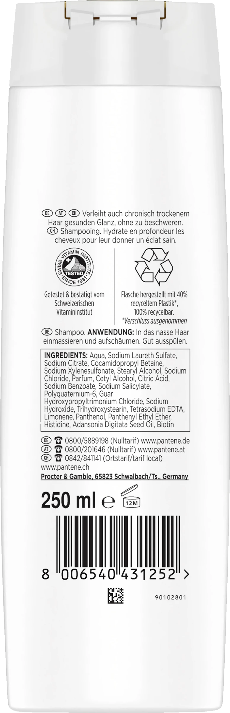 Aqua, Sodium Laureth Sulfate, Sodium Citrate, Cocamidopropyl Betaine, Sodium Xylenesulfonate, Stearyl Alcohol, Sodium Chloride, Parfum, Cetyl Alcohol, Citric Acid, Sodium Benzoate, Sodium Salicylate, Polyquaternium-6, Guar Hydroxypropyltrimonium Chloride, Sodium Hydroxide, Trihydroxystearin, Tetrasodium EDTA, Limonene, Panthenol, Panthenyl Ethyl Ether, Histidine, Adansonia Digitata Seed Oil, Biotin