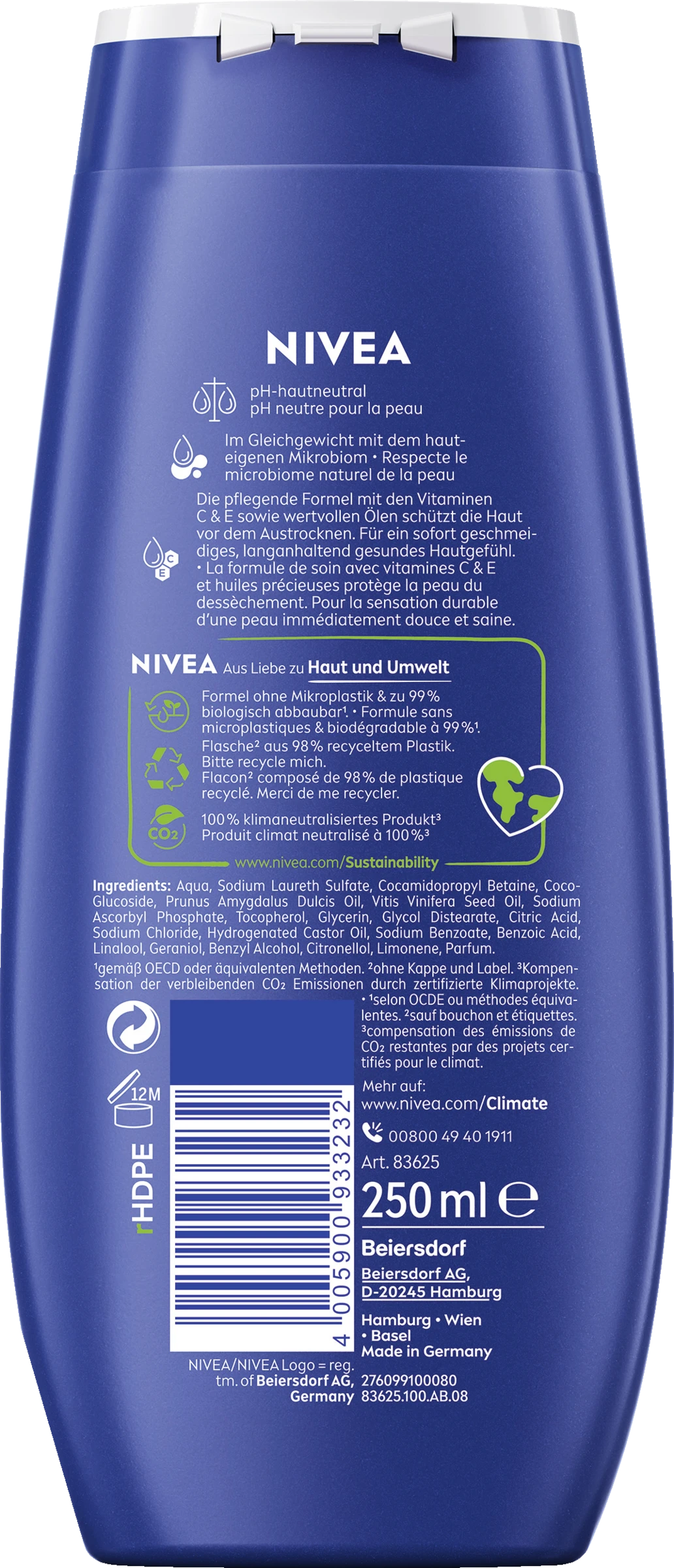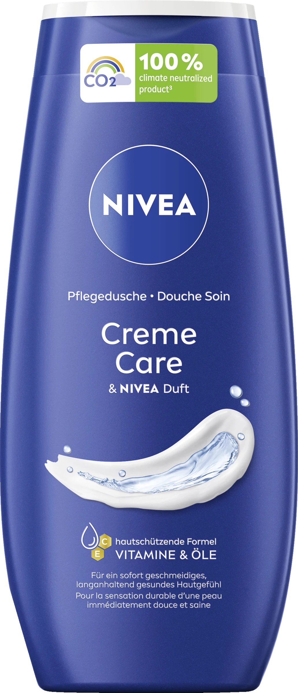 Spüren Sie, wie die NIVEA Creme Care Pflegedusche Ihre Haut unter der Dusche sanft reinigt und pflegt. Dank der Formel mit ausgesuchten Inhaltsstoffen der NIVEA Creme, angereichert mit Vitamine C & E und wertvollen Ölen spendet das seidige Duschgel Ihnen ein geschmeidiges Hautgefühl. Genießen Sie den samtweichen Schaum und den einzigartigen milden Duft. Dieses Duschgel ist zu 100% klimaneutralisiert und tut damit nicht nur Ihrer Haut, sondern auch der Umwelt etwas Gutes. Die Formel ist zu 99% biologisch abbaubar und enthält kein Mikroplastik. Die Flasche besteht zu 98% aus Recycling-Material, ohne Verschluss und Label. Verwandeln Sie jedes Duscherlebnis in einen verwöhnenden Pflegemoment mit NIVEA: Creme Care Pflegedusche.