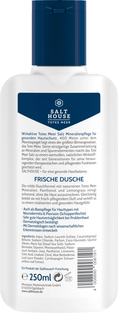 Aqua, Sodium Laureth Sulfate, Cocamidopropyl Betaine, Sodium Chloride, Parfum, Coco-Glucoside, Glyceryl Oleate, Maris Sal (Dead Sea Salt), Sodium Benzoate, Glycerin, Phenoxyethanol, Potassium Sorbate, Urea, Panthenol, Limonene, Citric Acid, Linalool, Citral, Aloe Barbadensis Leaf Juice Powder, Cymbopogon Schoenanthus Leaf Extract