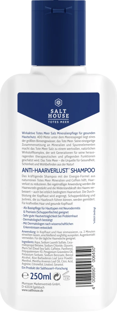 Das kräftigende Shampoo mit der innovativen Energie-Formel aus naturreinen Totes Meer Mineralien und Coffein hilft, Haarverlust zu reduzieren. Bei regelmäßiger Anwendung werden die Haarwurzeln gestärkt und die Widerstandskraft des Haares verbessert – auch bei erblich bedingtem Haarverlust. Die Durchblutung der Kopfhaut wird angeregt, Schuppenbildung und Juckreiz, die zu Haarbruch führen können, werden gemildert. Für kraftvolles Haar und gesunde Kopfhaut!