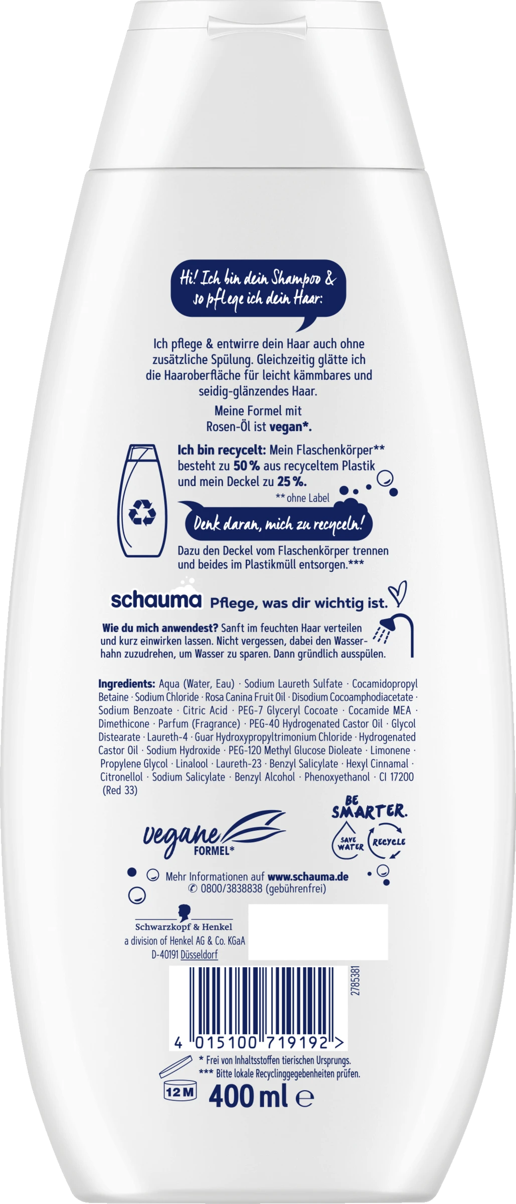 Aqua (Water, Eau), Sodium Laureth Sulfate, Cocamidopropyl Betaine, Sodium Chloride, Rosa Canina Fruit Oil, Disodium Cocoamphodiacetate, Sodium Benzoate, Citric Acid, PEG-7 Glyceryl Cocoate, Cocamide MEA, Dimethicone, Parfum (Fragrance), PEG-40 Hydrogenated Castor Oil, Glycol Distearate, Laureth-4, Guar Hydroxypropyltrimonium Chloride, Hydrogenated Castor Oil, Sodium Hydroxide, PEG-120 Methyl Glucose Dioleate, Limonene, Propylene Glycol, Linalool, Laureth-23, Benzyl Salicylate, Hexyl Cinnamal, Citronellol, Sodium Salicylate, Benzyl Alcohol, Phenoxyethanol, CI 17200 (Red 33)