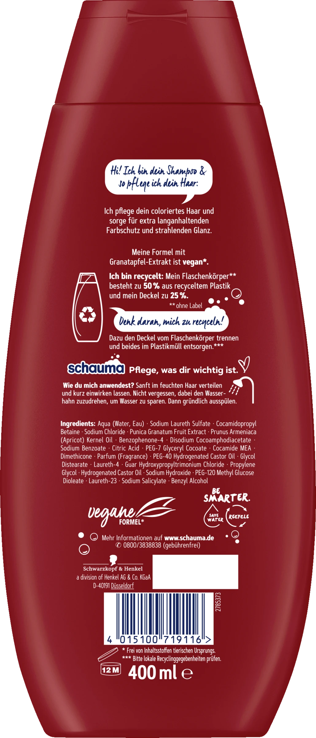 Hi! Ich bin dein Shampoo & so pflege ich dein Haar: Ich pflege dein coloriertes Haar und sorge für extra langen Farbschutz und langanhaltenden Glanz. Meine Formel mit Granatapfel-Extrakt ist vegan*. Ich bin recycelt: Mein Flaschenkörper** besteht zu 50% aus recyceltem Plastik und mein Deckel besteht zu 25% aus recyceltem Plastik. Denk daran, mich zu recyceln! Dazu den Deckel vom Flaschenkörper trennen und beides im Plastikmüll entsorgen.***