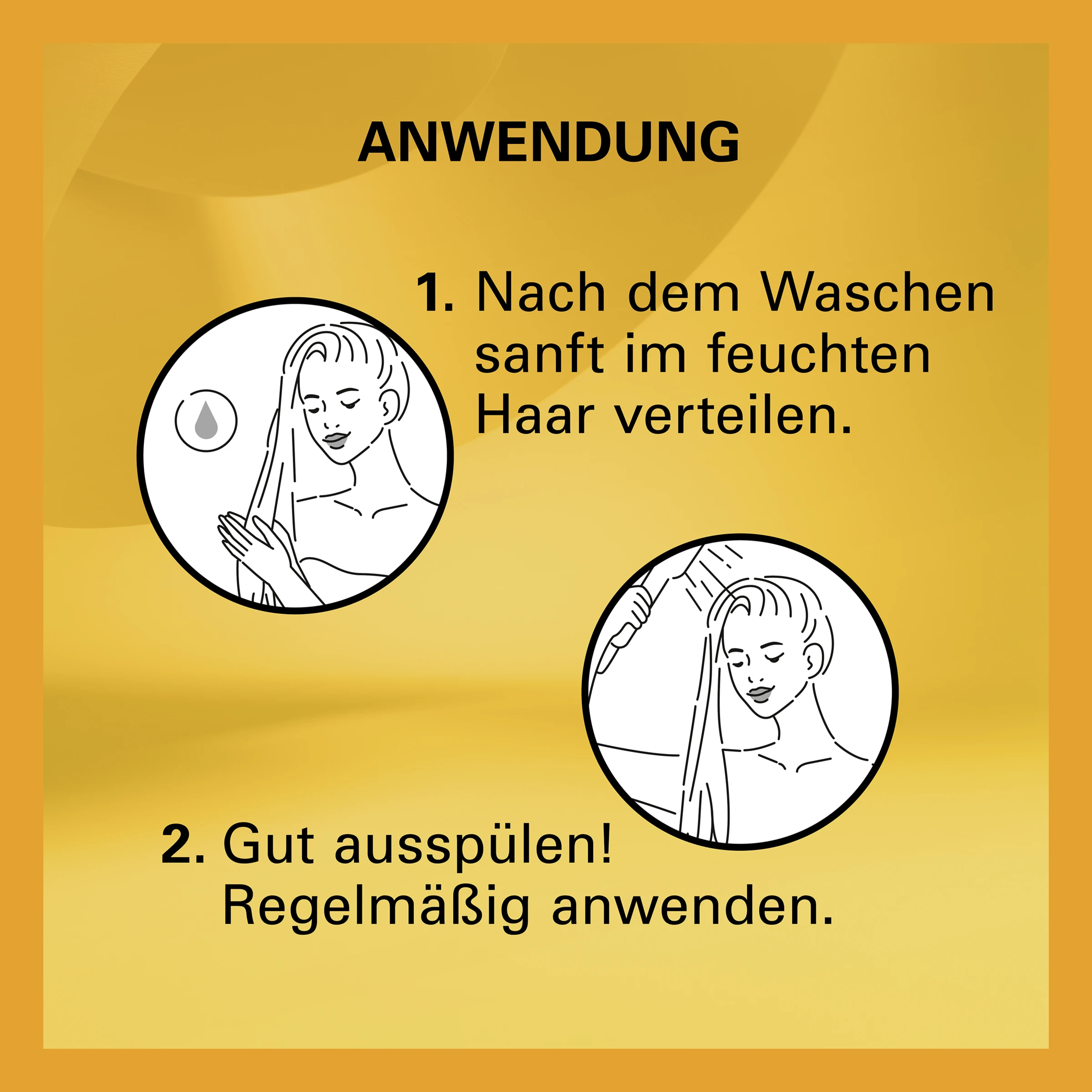 Nach dem Waschen sanft im feuchten Haar verteilen. Gut ausspülen! Regelmäßig anwenden.