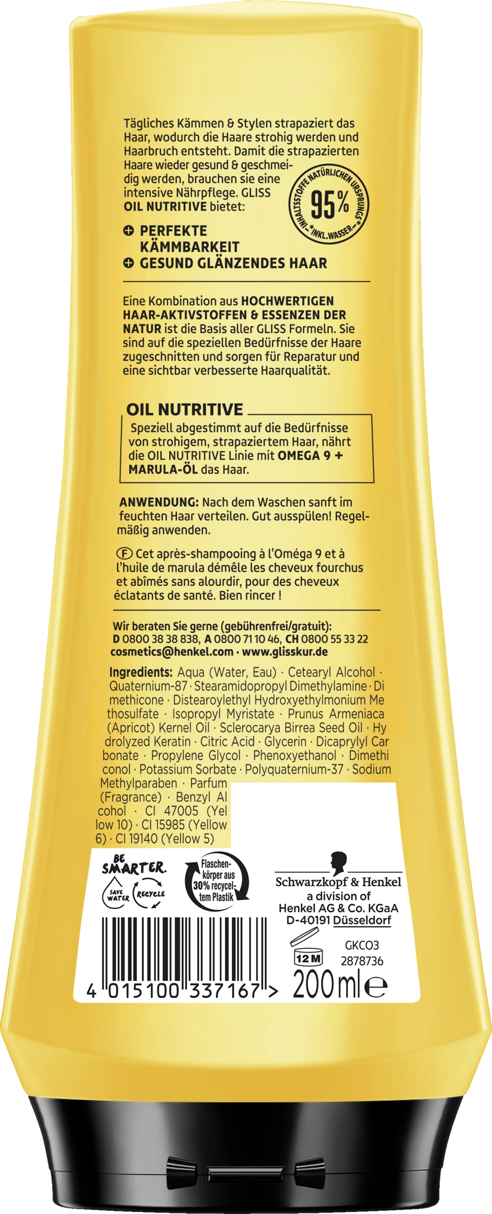 Aqua (Water, Eau), Cetearyl Alcohol, Quaternium-87, Stearamidopropyl Dimethylamine, Dimethicone, Distearoylethyl Hydroxyethylmonium Methosulfate, Isopropyl Myristate, Prunus Armeniaca (Apricot) Kernel Oil, Sclerocarya Birrea Seed Oil, Hydrolyzed Keratin, Citric Acid, Glycerin, Dicaprylyl Carbonate, Propylene Glycol, Phenoxyethanol, Dimethiconol, Potassium Sorbate, Polyquaternium-37, Sodium Methylparaben, Parfum (Fragrance), Benzyl Alcohol, CI 47005 (Yellow 10), CI 15985 (Yellow 6), CI 19140 (Yellow 5)