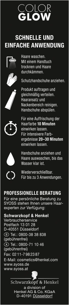 Tauchen Sie ein in eine Welt, in der Sie die Farbe Ihrer Persönlichkeit nach außen tragen können – mit Syoss Colorglow. Die Neuerfindung der semi-permanenten Farbtönungen von Syoss verleiht Ihnen und Ihrem Haar einen strahlenden glow. Kreieren Sie mutige und farbintensive Looks und erleben Sie, dank intensiver Farbpigmente, eine strahlende Farbintensität, die bis zu 8 Haarwäschen hält und erste graue Haare überdeckt. Machen Sie sich bereit, Ihre Persönlichkeit auszudrücken, indem Sie ein farbintensives Statement setzen, ohne sich langfristig zu binden!
